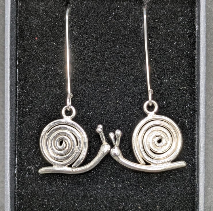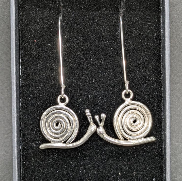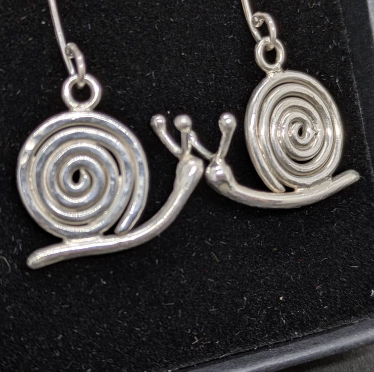Since I made these earrings, I see snails in a whole new light! I love the coil of their shells and those little antennae are just so cute. I think they're really quite irresistible. The earrings have been hand forged using sterling silver wire and the fun part was making those antennae which I think gives them their personality. These are long earrings that look great on, with a drop of 4.8cm. Stand by for compliments!
