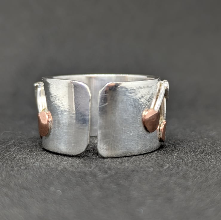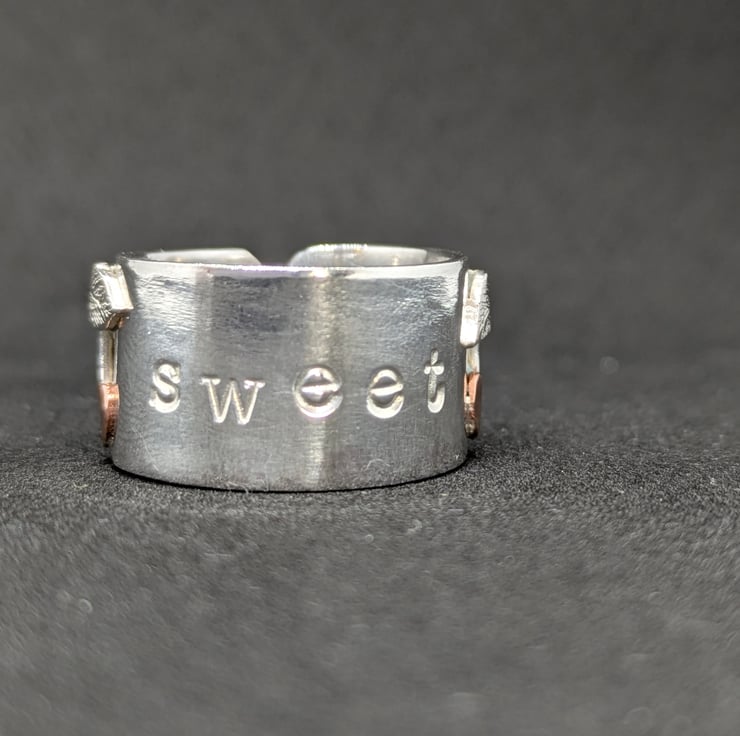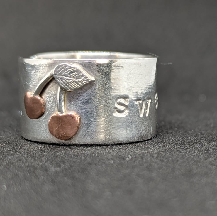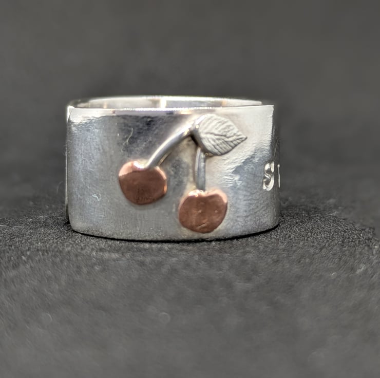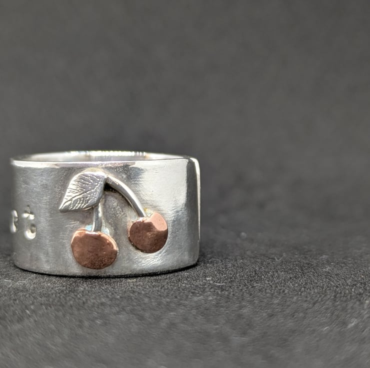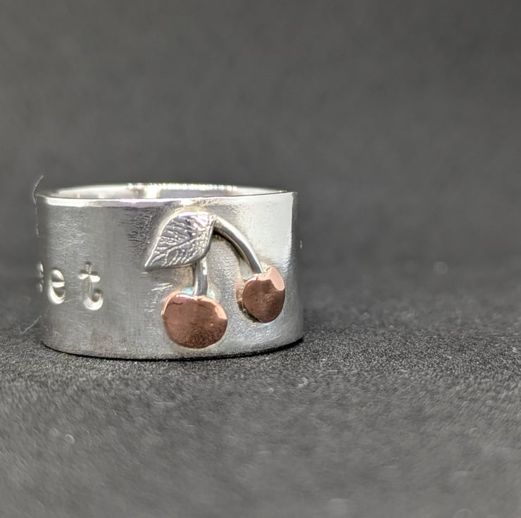 Perfect for summer, this sterling silver band ring has been entirely handmade. The ring features two sets of shiny hand saw pierced copper cherries, with silver stalks and an engraved silver leaf. Between the cherries, the word 'sweet' has been stamped into the ring. This is a substantial, one of a kind ring, that will expand to suit a bigger size. It is a size P.