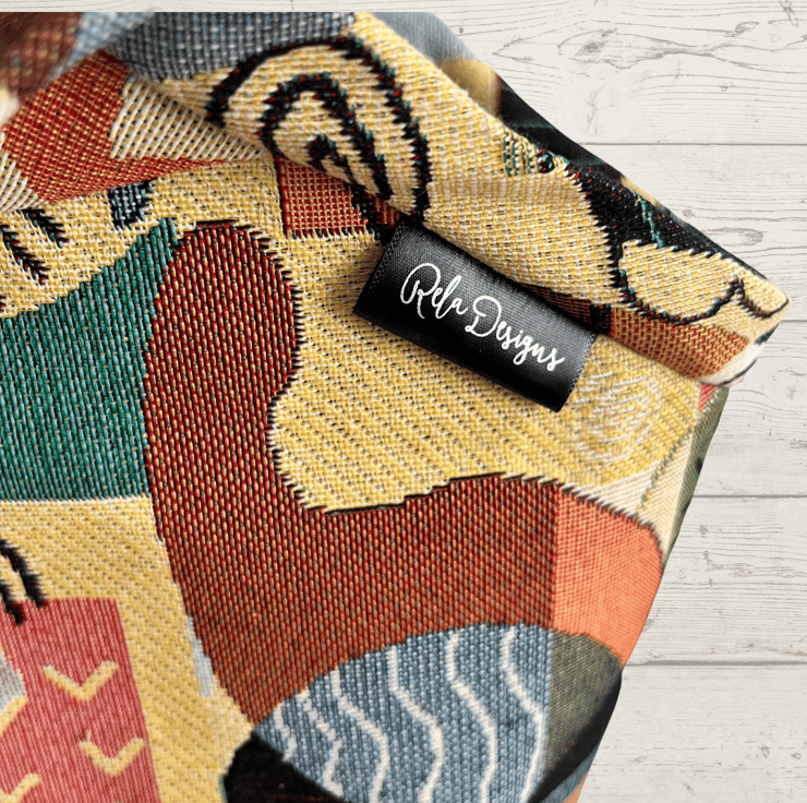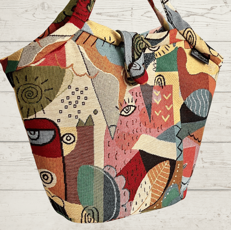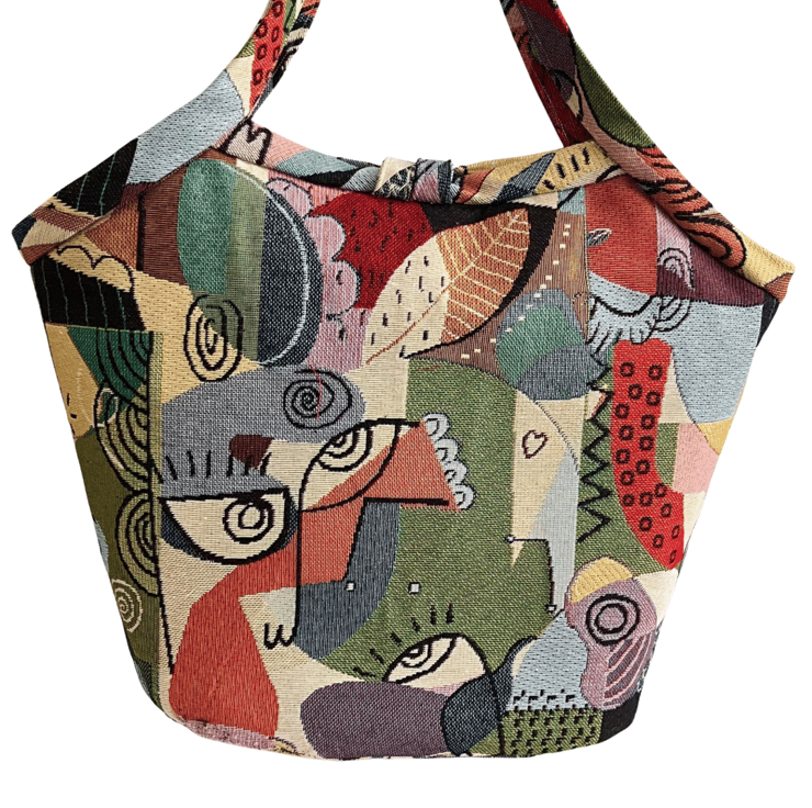 Add a splash of color and character to your everyday look with this stunning handmade bucket bag. Crafted from high-quality tapestry fabric, this bag features a colourful pattern of abstract faces and leaves.