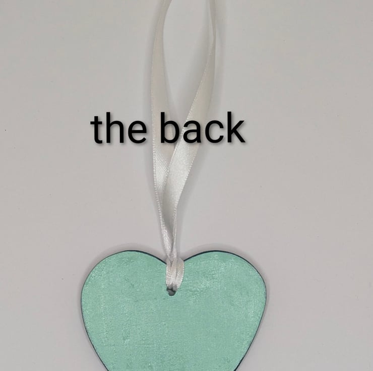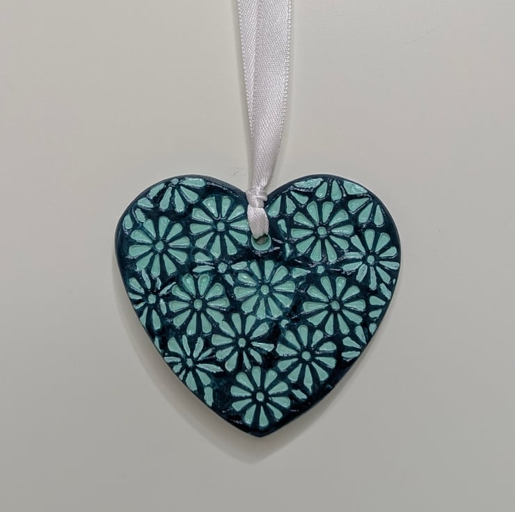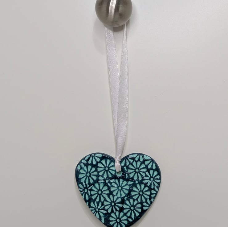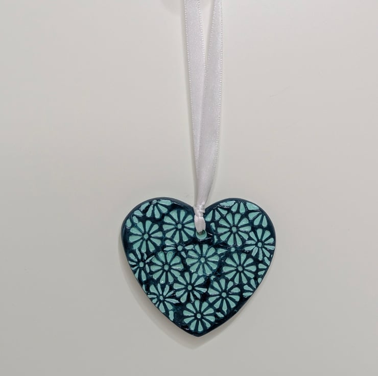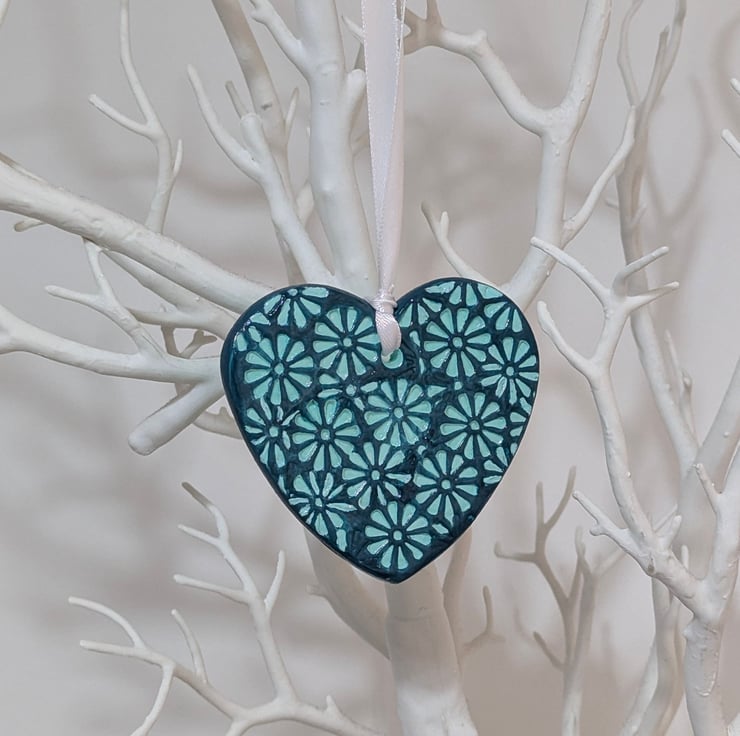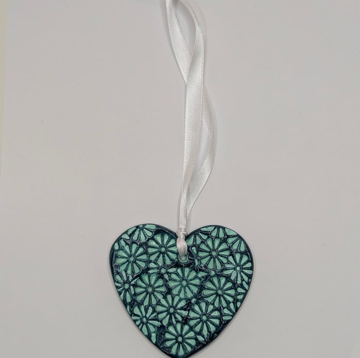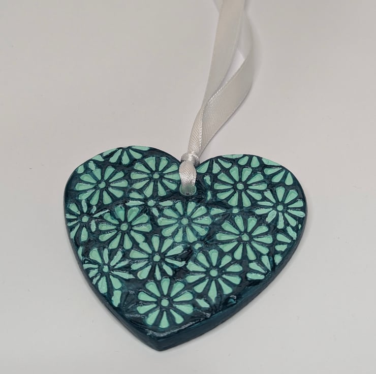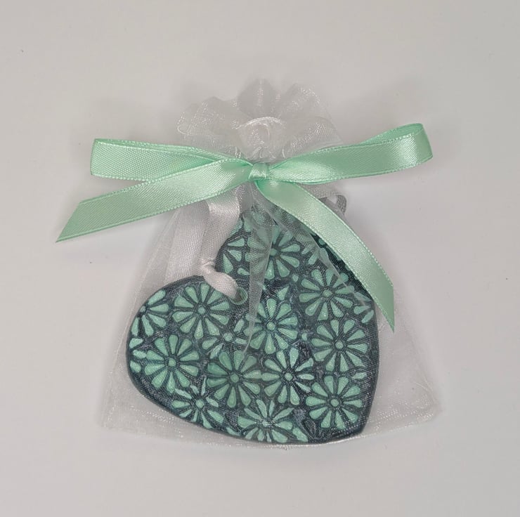 Pretty two-tone mint and dark green handmade clay heart decoration. This pretty heart has been lovingly created from air dry clay and embossed with a floral pattern on the front and the back has been left smooth. The heart has been painted with mint and dark green acrylic paints and finished with varnish. This decorative heart comes ready to hang from white satin ribbon and will be supplied in a white organza bag tied with mint coloured ribbon and a Crafty Nature label. This gorgeous hanging decoration would make a lovely gift for many occasions including a birthday, anniversary, new home, thank you, Christmas stocking filler or addition to your own home decor.