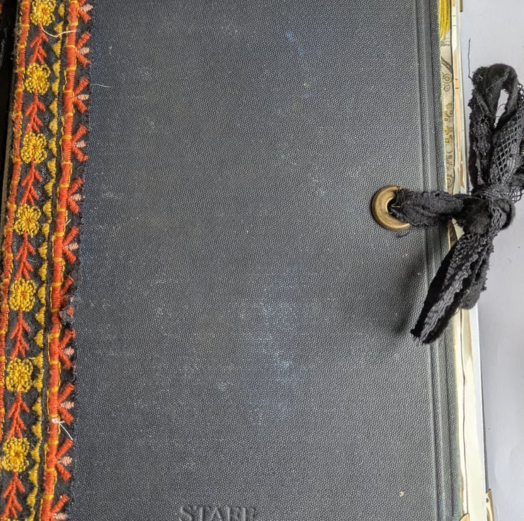 This anthem book was once a song book ready to be thrown out.I took the book apart created a new spine reused pages and added pages to create in ,the paper I added is stained to look aged .I used good quality paper which can with stand moderate painting .The cover is the original book cover and I added a closure or black lacy ribbon .The signatures are removable so you can add or take away ..this book will make a stunning addition to your collection of the perfect gift .