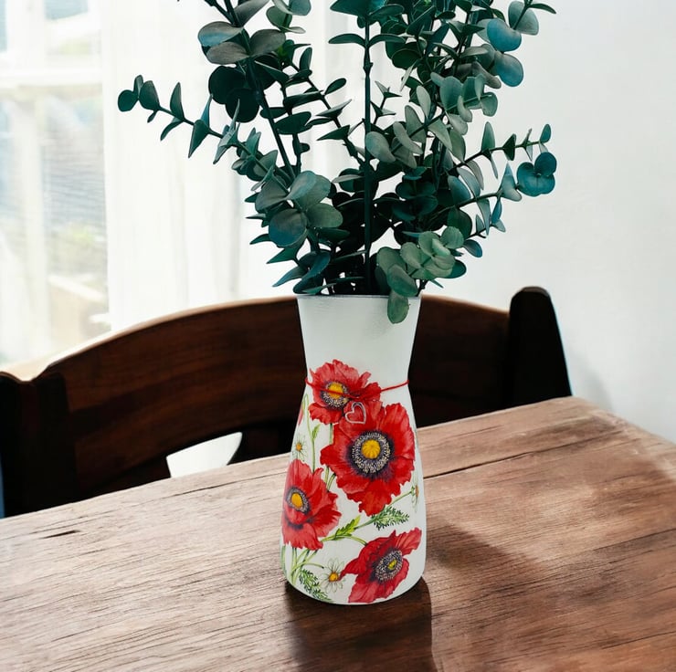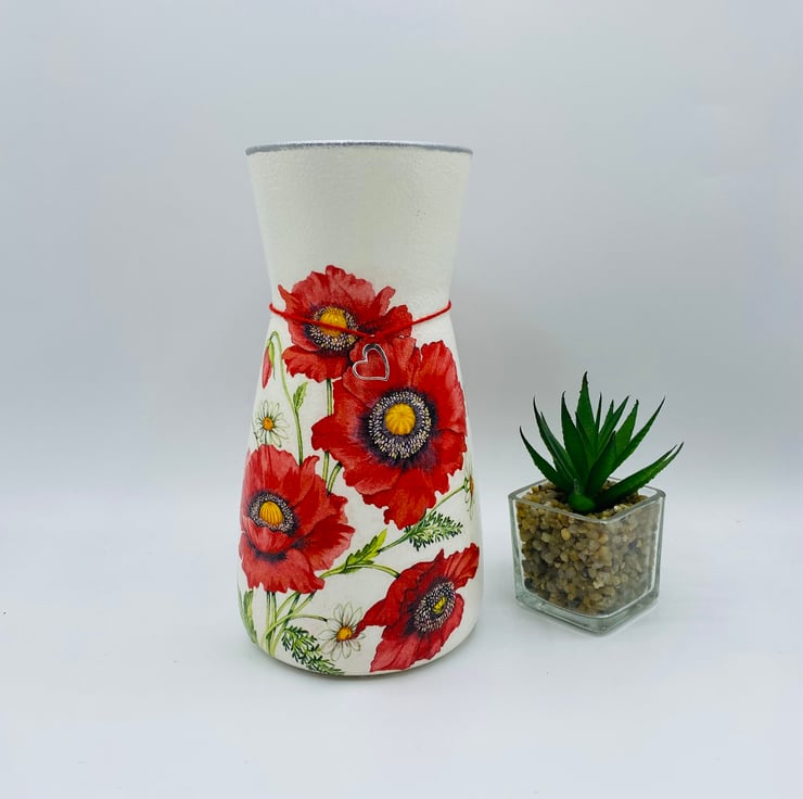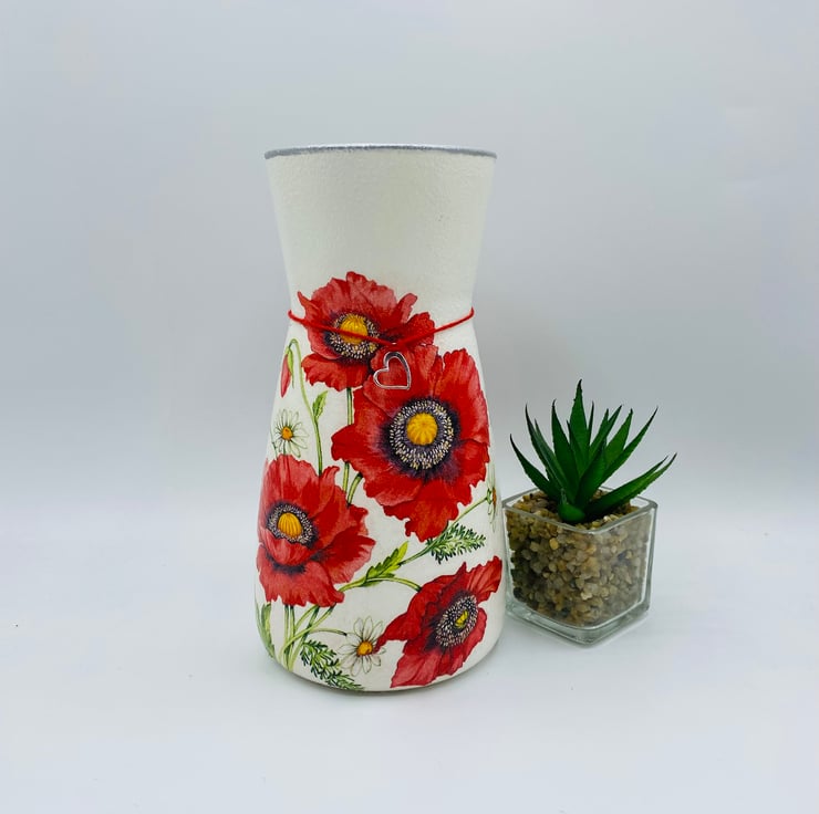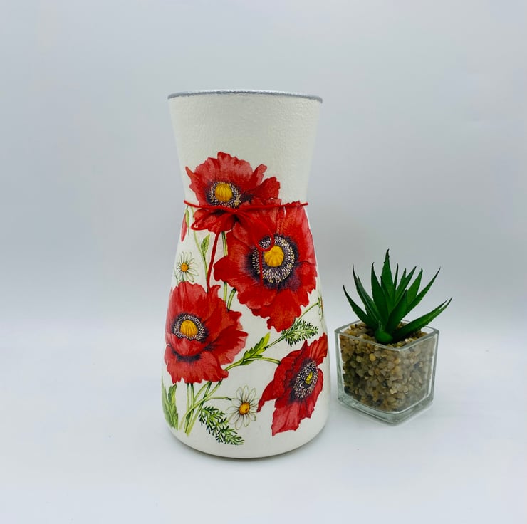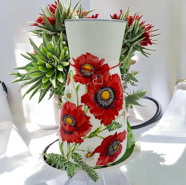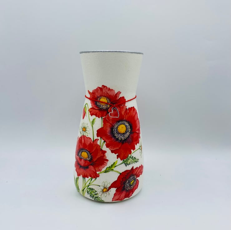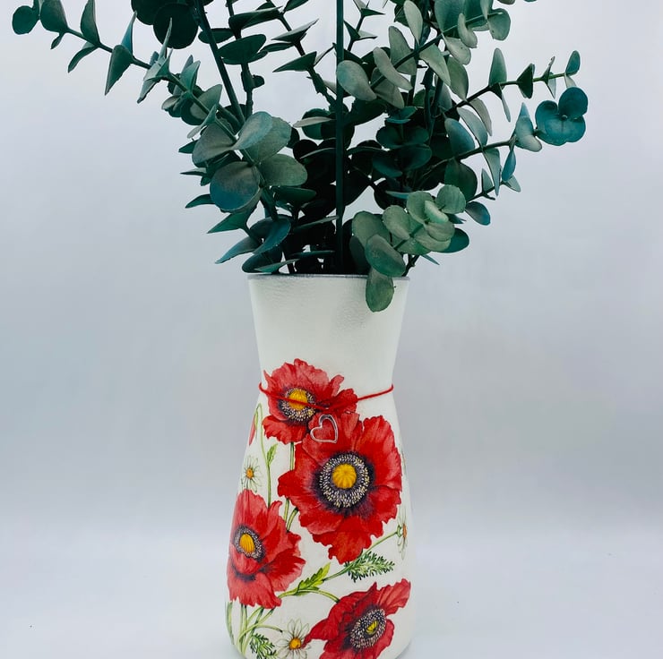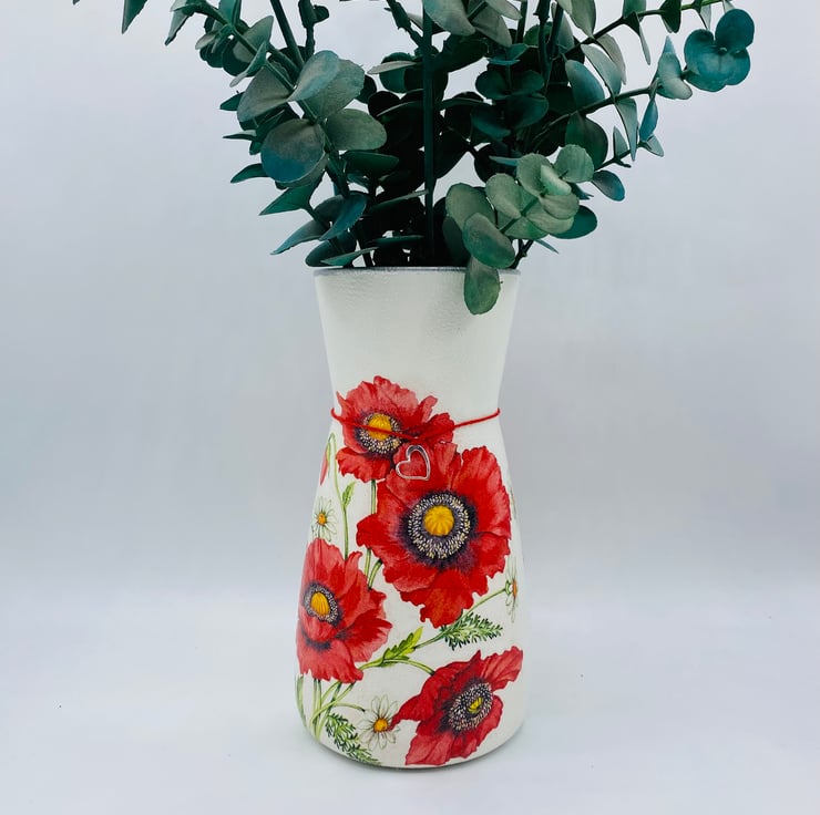 This beautifull vase has been carefully painted in a soft, classic white and features a decoupage design showcasing beautiful red poppies.