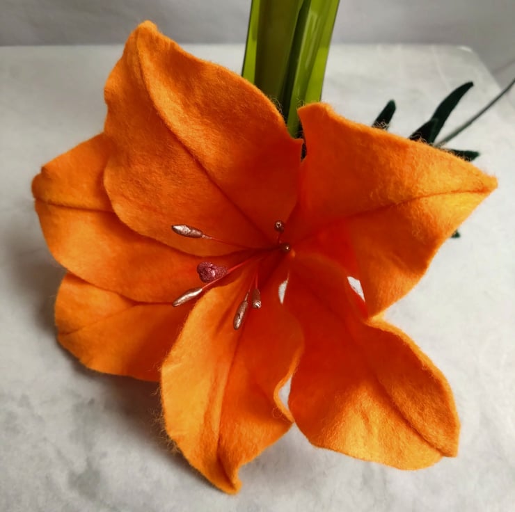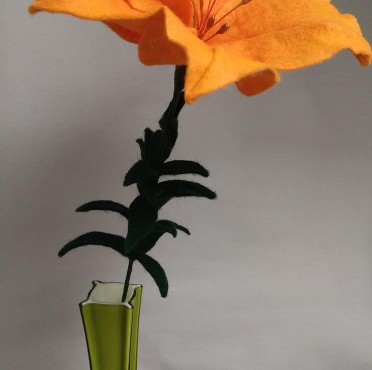 A beautiful and realistic lily made by me from wool blend felt. I have hand cut and shaped the petals and leaves to make it as realistic as possible. The flower and petals are wired so can be bent into shape. The flower stem length is 37cm approximately and the flower is about 16cm across. If you need the flower to be shorter, just let me know and i can trim it to suit. The price is for one lily stem and the vase is not included. FREE UK POSTAGE