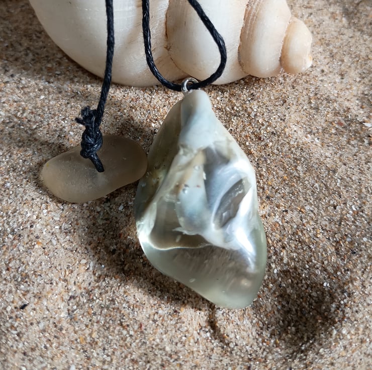 This one-of-a-kind pendant cradles a naturally worn shell fragment in crystal-clear resin, capturing its soft edges, hidden hollows, and subtle sea-sculpted story. Measuring approximately 3.5cm long by 2cm wide, it hangs from a simple black cord alongside a small piece of frosted sea-glass — a pairing as peaceful as wave and shore.