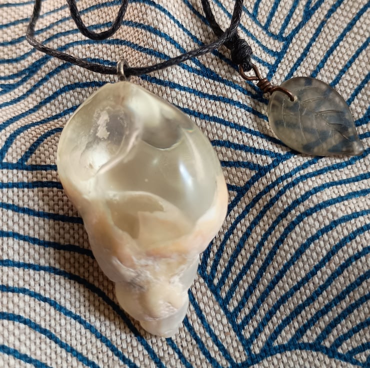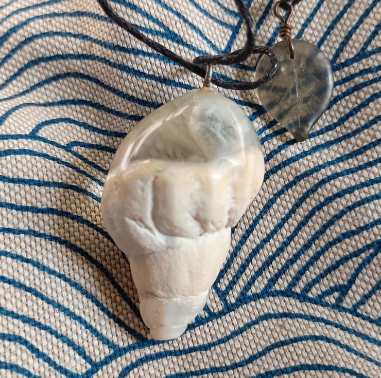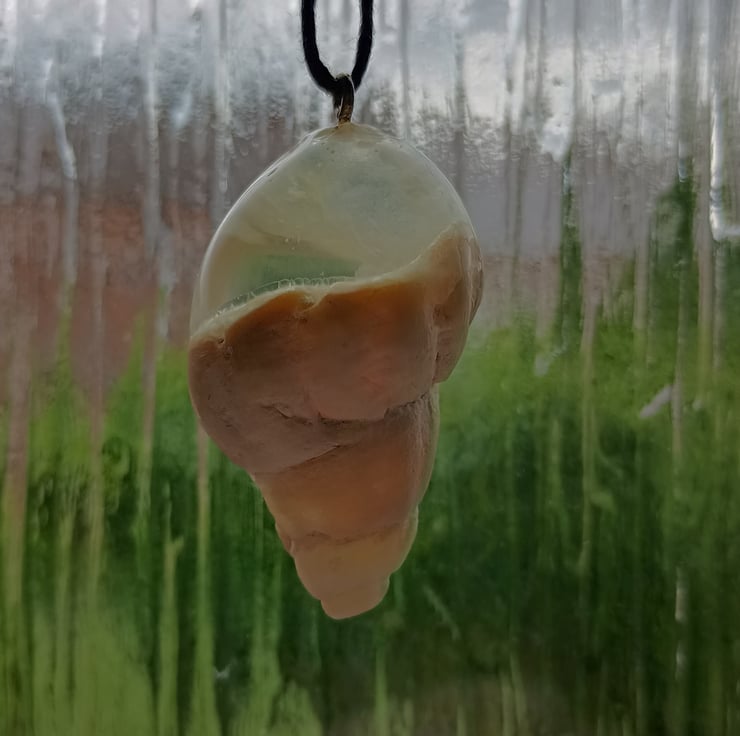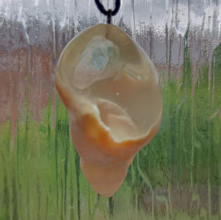 This dreamy 4cm x 2.5cm pendant pairs a creamy natural shell with a translucent, pale resin that seems to hold a light all of its own — like seafoam suspended in a breeze. Gentle swirls and tiny inner bubbles give the sense of motion stilled in time, a tidebreaker frozen mid-curve.