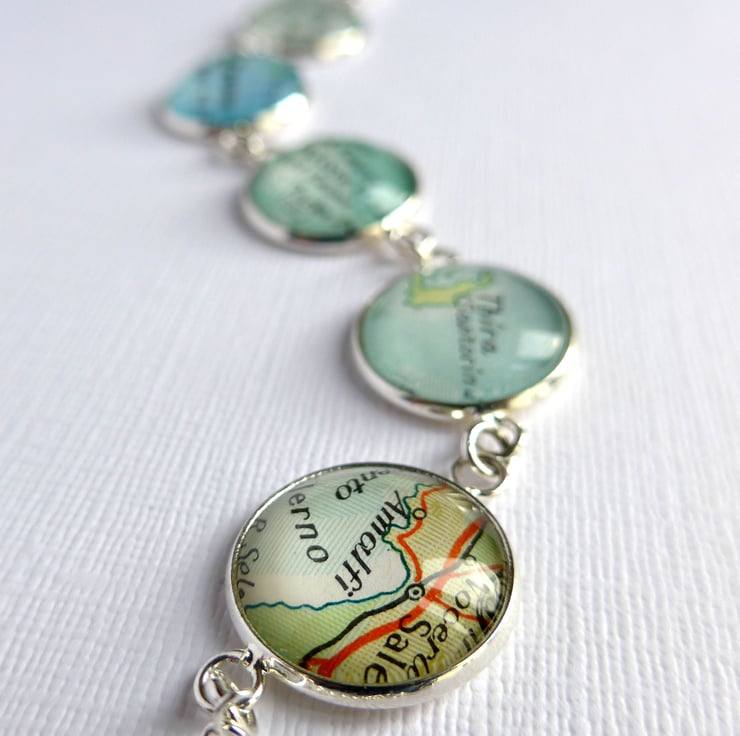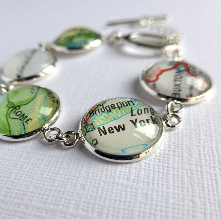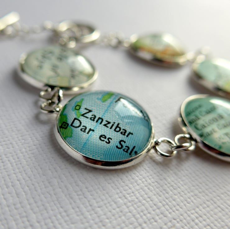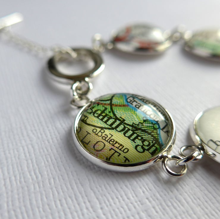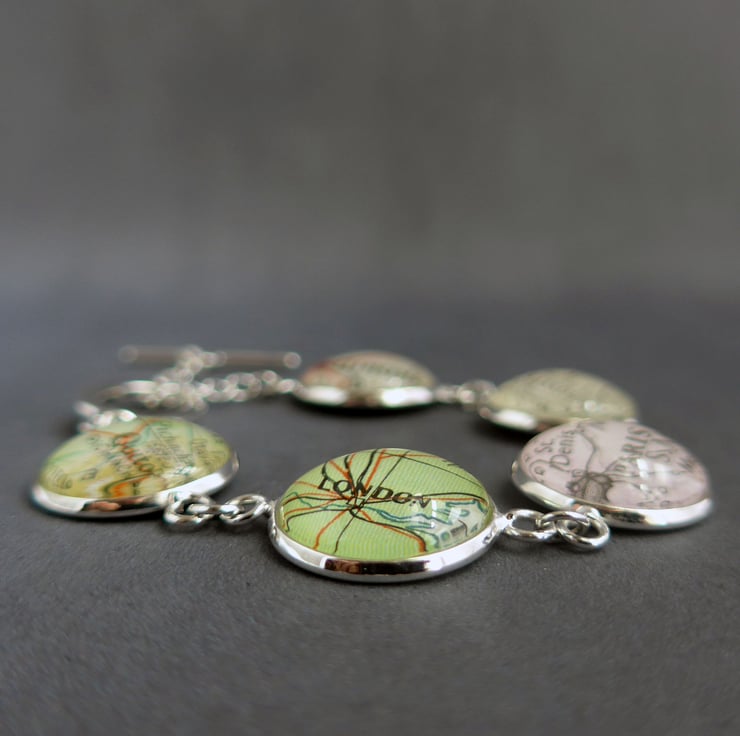 Searching for that perfect gift for her? This silver plated bracelet bears five glass cabochons, each one sealing a personalised section of map. You choose the five map locations in order to customise the bracelet.