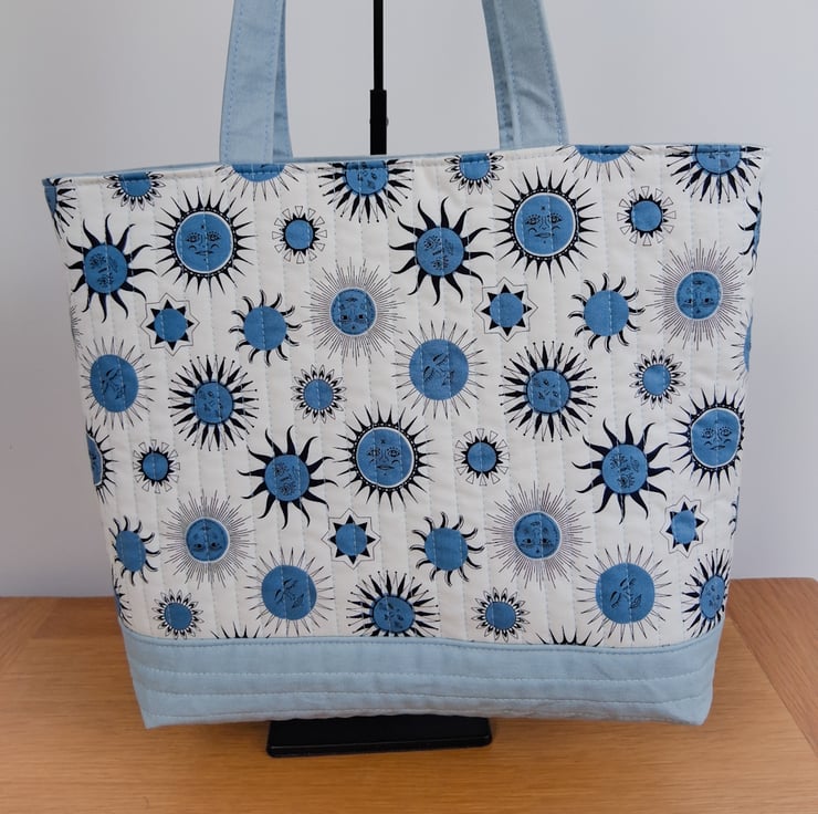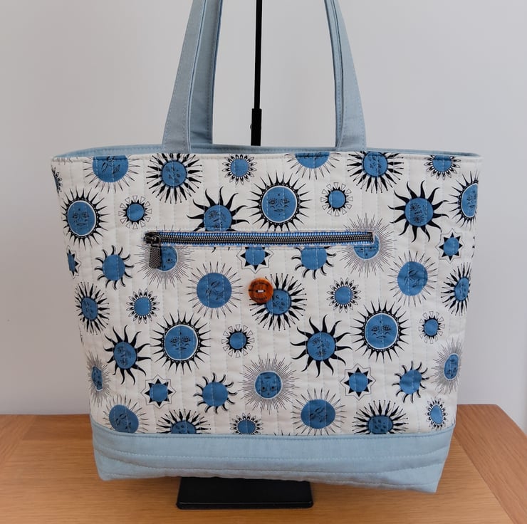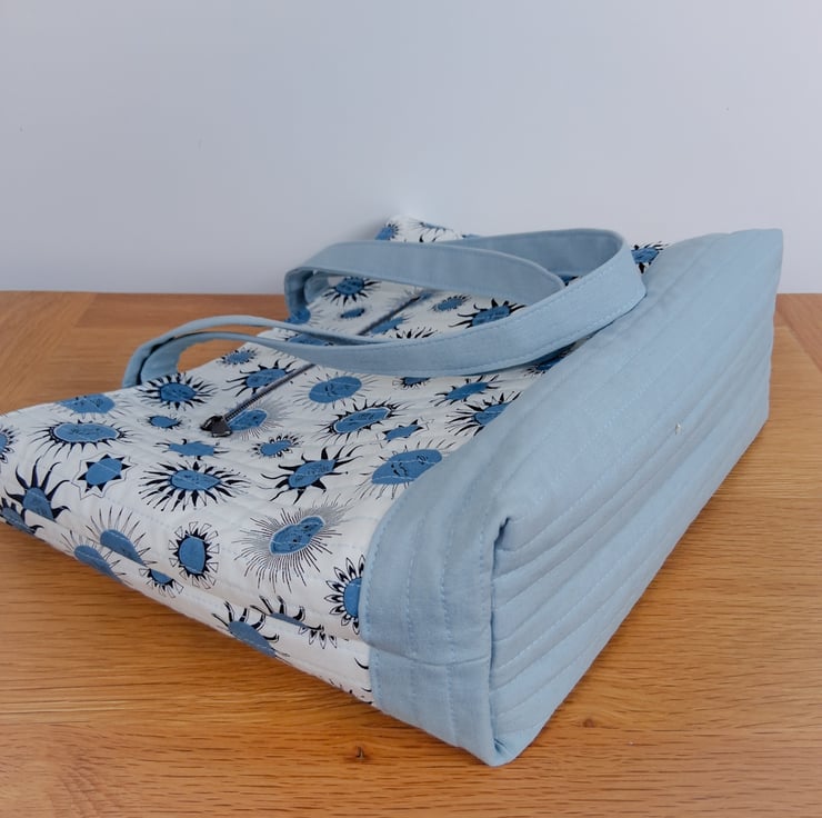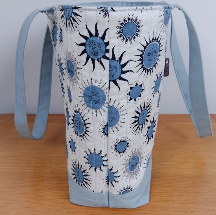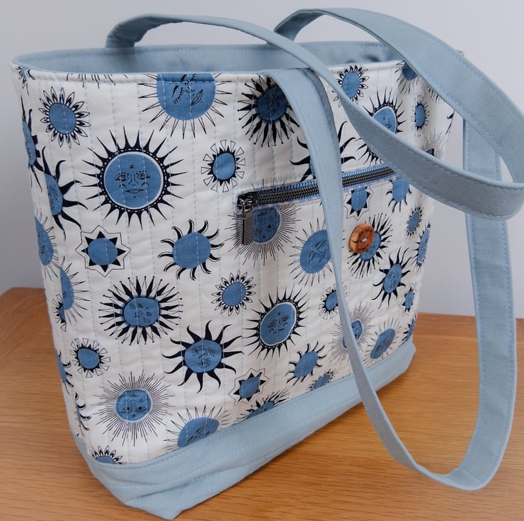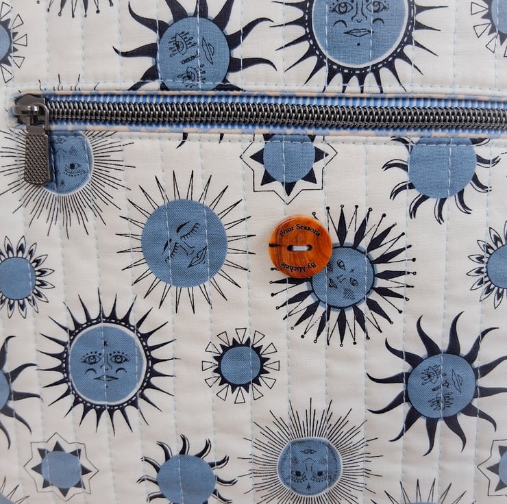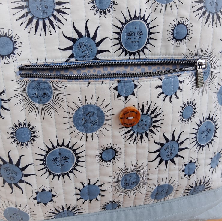 The exterior of this bag is a lovely 100% cotton printed fabric called Starry Sky, by April Rosenthal for Moda. I have quilted it with straight lines and inserted a zipped pocket into the front panel. This has a co-ordinating dark grey coloured zip and textured zip pull..