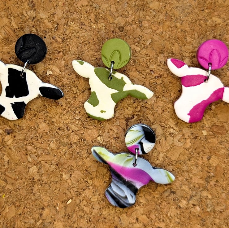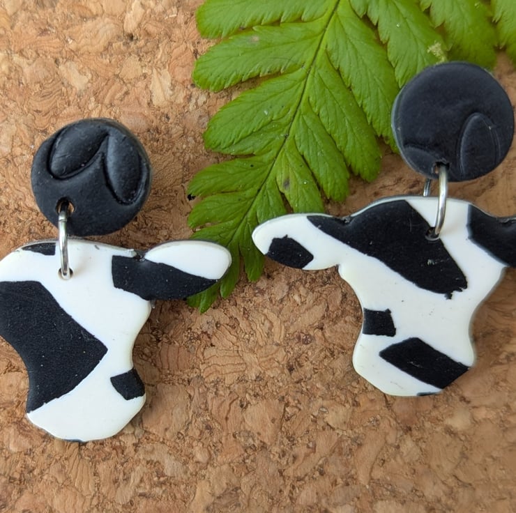 Embrace timeless charm with a playful twist! These classic black and white cow print drop earrings are meticulously handcrafted from lightweight polymer clay, making them comfortable for all-day wear. Each earring features an adorable cow-shaped dangle with the iconic black and white mottled pattern, perfectly capturing the essence of a farm favourite. They are topped with a matching solid black stud, creating a cohesive and stylish accessory. Perfect for lovers of farm animals, rustic styles, or anyone looking for a fun yet classic statement piece. These unique earrings are carefully made with attention to detail, ready to add personality to any outfit.