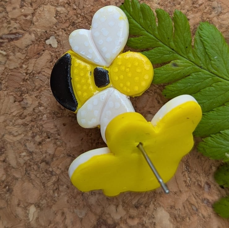 Each little bee is crafted with care from Fimo polymer clay, featuring bright yellow bodies with distinctive black stripes and lovely white wings. We've added tiny dots of acrylic paint to the wings and head for extra detail and a playful texture that really makes these earrings pop.