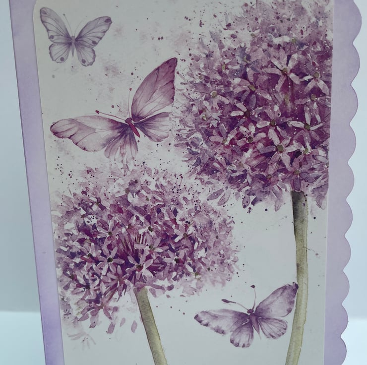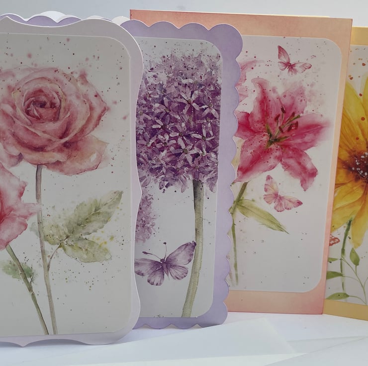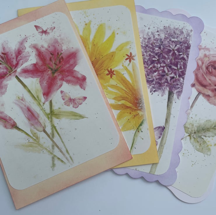 A set of floral blank cards that can be used for notelets or any occasion you wish. These A6 sized cards are all different, different colours, card shape and floral design. There is a rose design with a butterfly on a fancy shaped card with a delicate inked edge. There is a lily design with a butterfly on a straight sided cream card with pink inking. The third is of purple Allium flowers with butterflies on a scalloped edged card with purple inking. The last is a sunflower with butterflies on a straight sided cream card with pale gold inking. They are all blank inside so you can write what you want, add a greeting for any occasion if you please. A lovely way to send a message to a loved one.