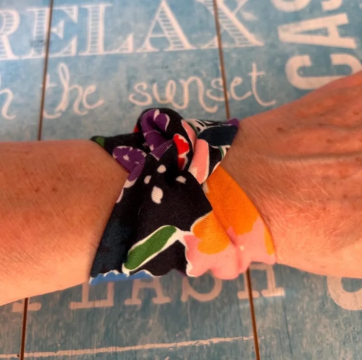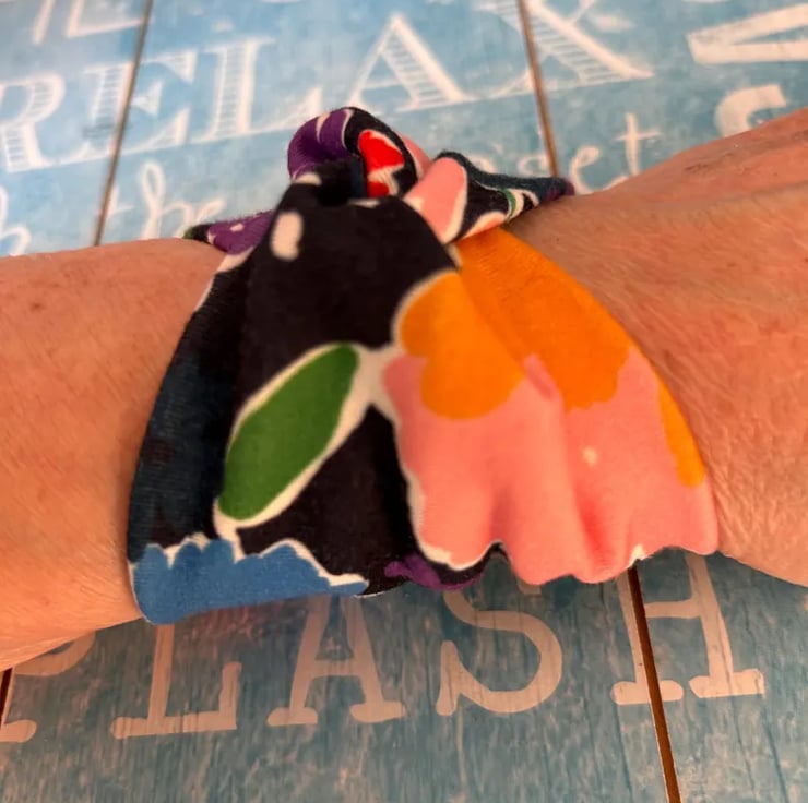 A bold and happy colourful fabric twist cuff bracelet. With a boho feel.
