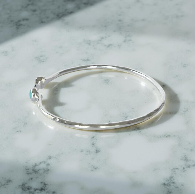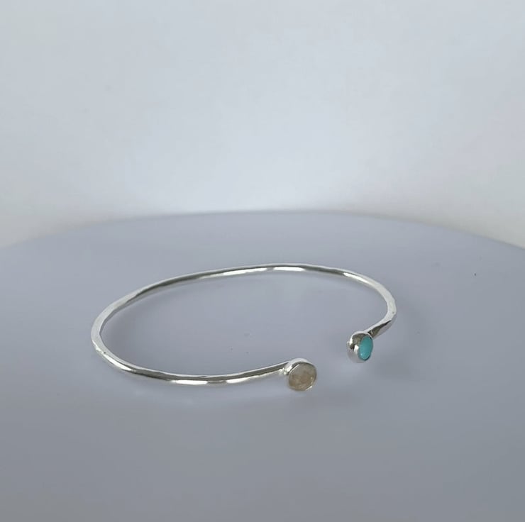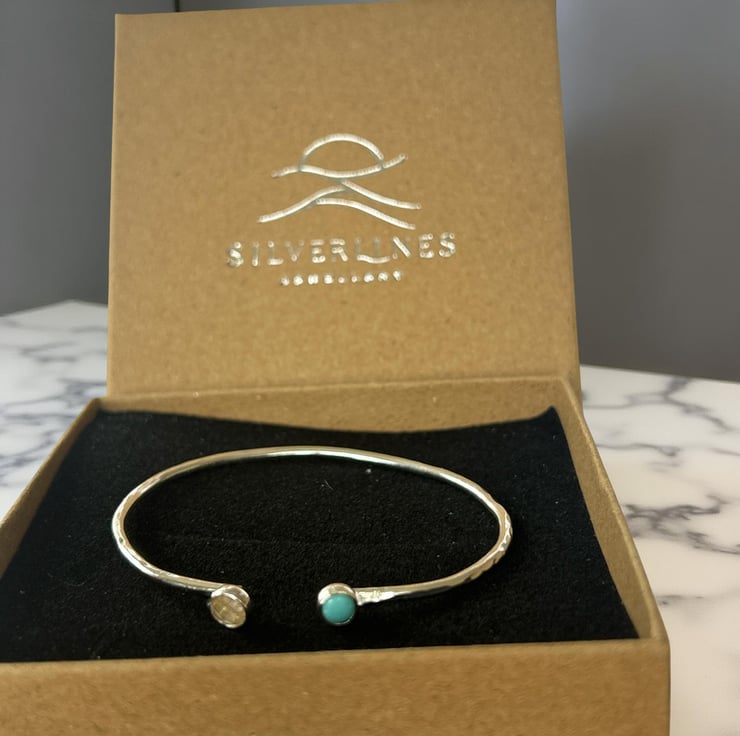 A stunning handcrafted sterling silver cuff made from ethical recycled silver, featuring a 4mm vibrant Turquoise and delicate 4mm pink quartz gemstones on either side. The unique bohemian style piece by SilverLines Jewellery can be customised with your choice of stones. Thoughtfully designed and artisan - made in Wlolacombe, North Devon.