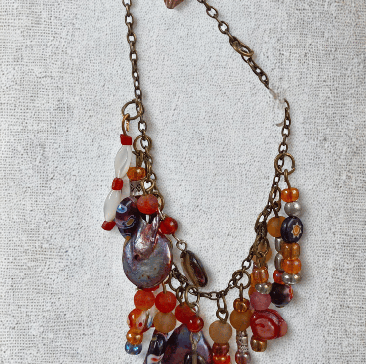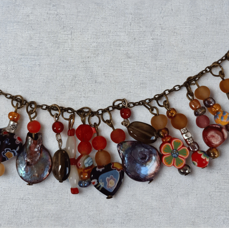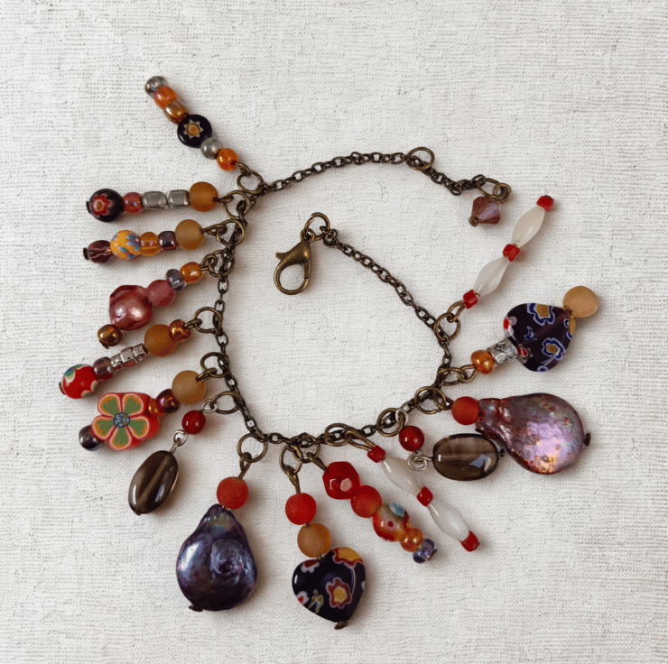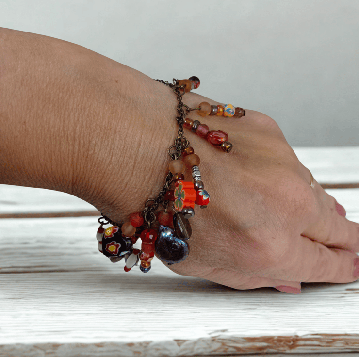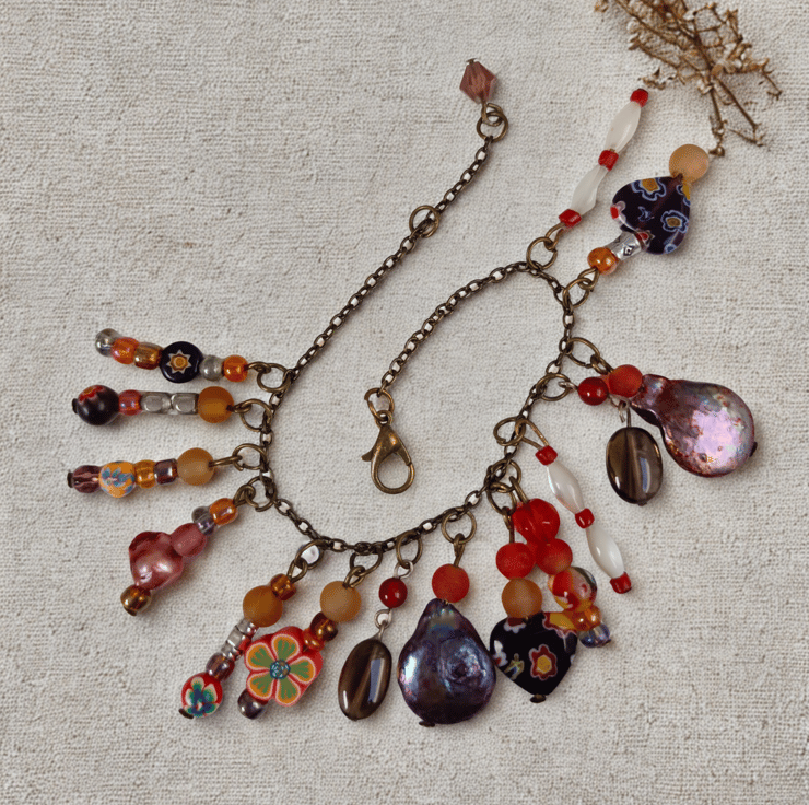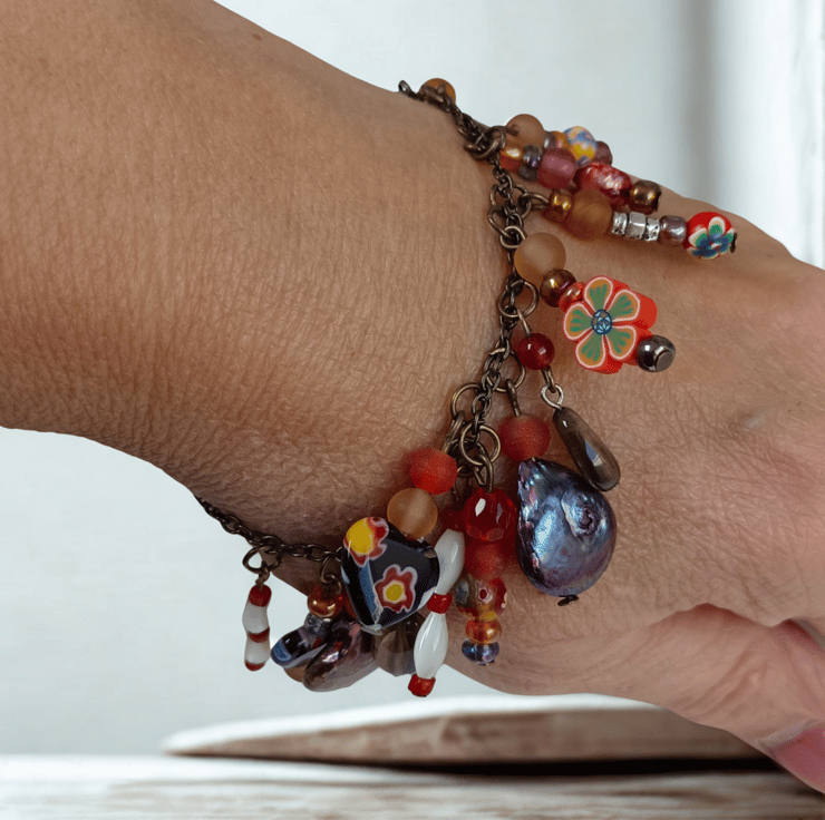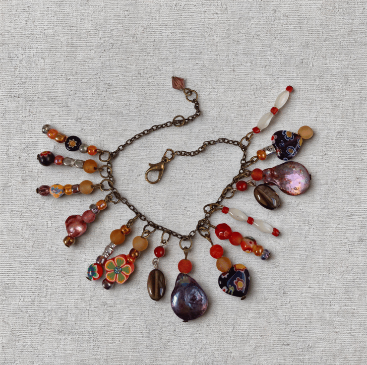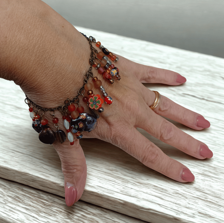 All the colours of the Autumn season and more in this lovely beaded bracelet. Made with many recycled beads on tiny threads attached to a delicate antique brass coloured chain. Beautiful beads made in glass, ceramic, shell, polymer clay, and wood. The chain is adjustable as there are many links amin the chain which is 18cm long. The bracelet will arrive carefully wrapped in tissue with ribbon.