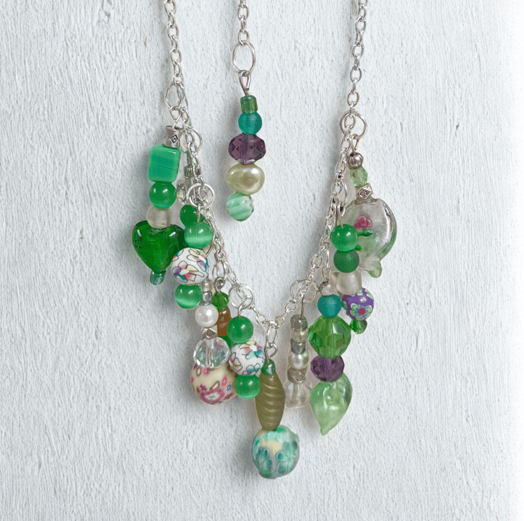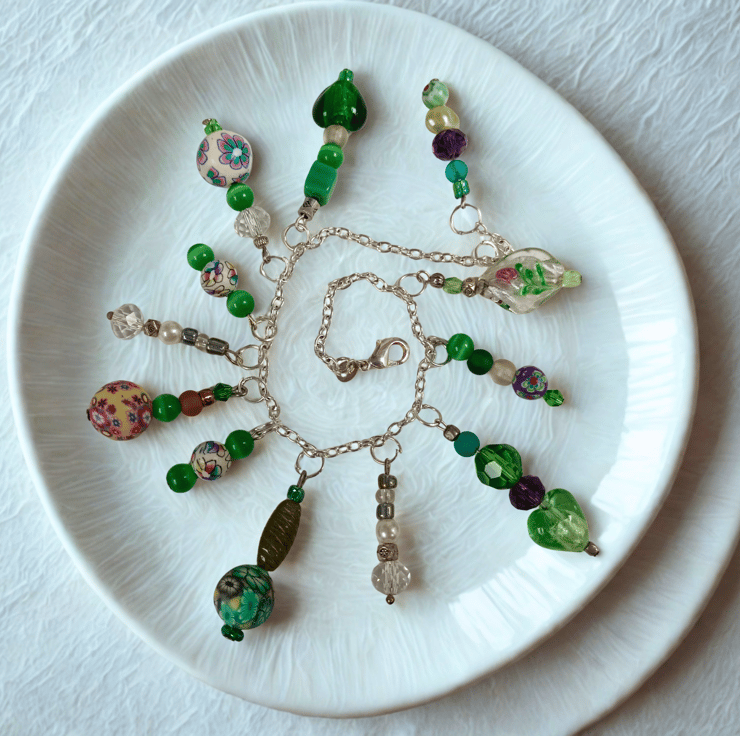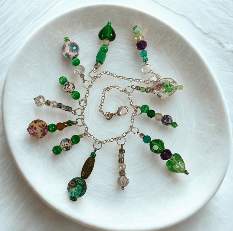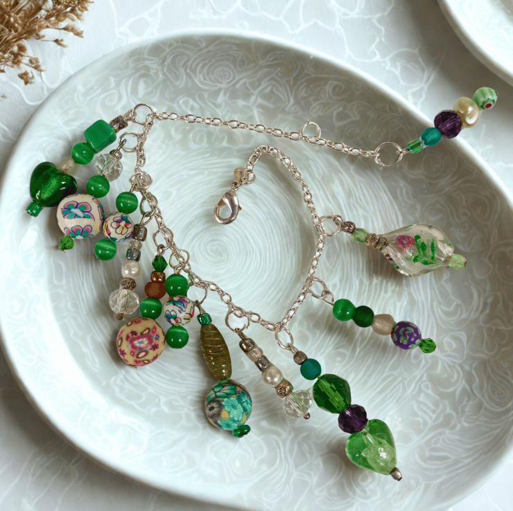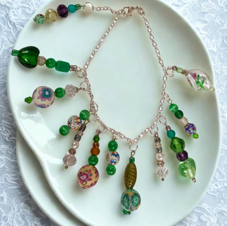 Light and fresh dangley bracelet in beautiful beaded greens. Little beaded threads of recycled beads hang off this 925 silver chain. Lampwork glass beads, Tibetan silver, ceramic, acrylic, frosted glass and faceted glass beads. The chain is approximately 21cm long, has a lobster catch, and is adjustable. Will arrive wrapped in tissue with ribbons.