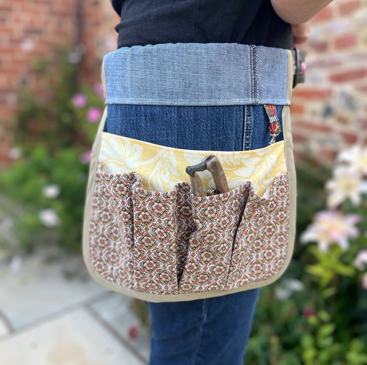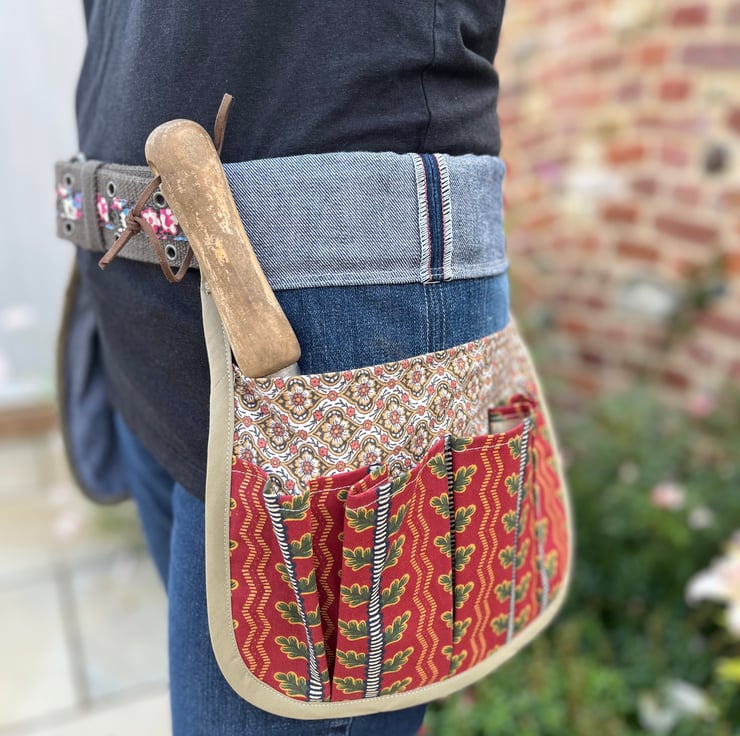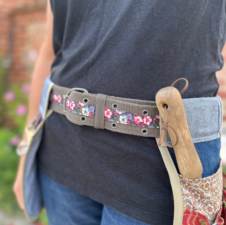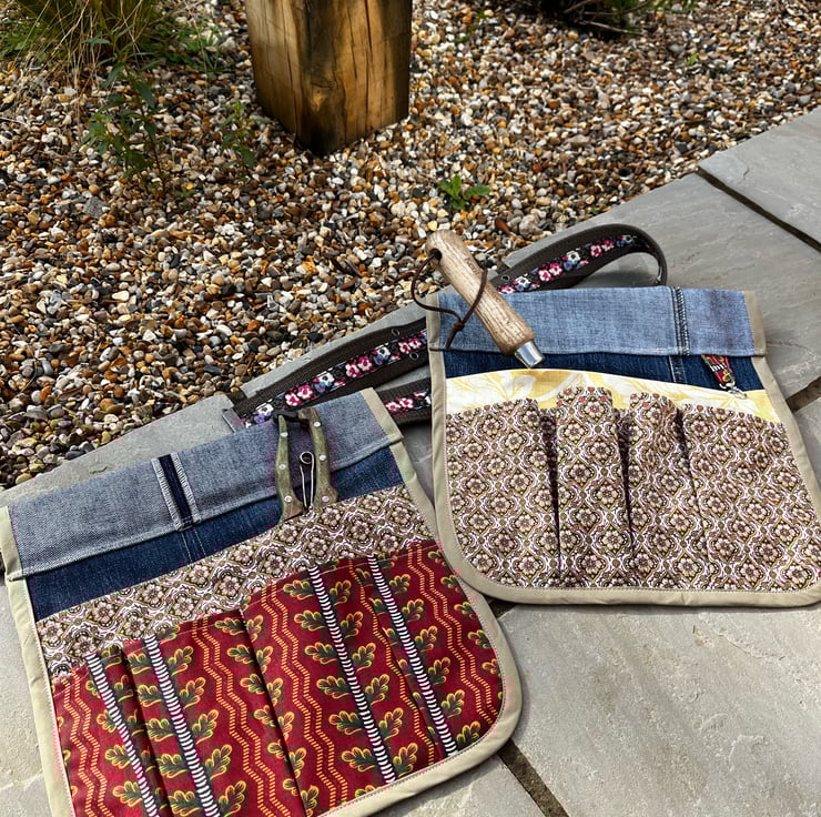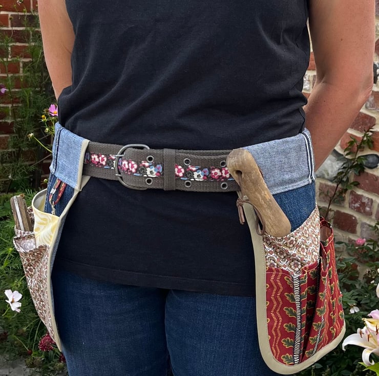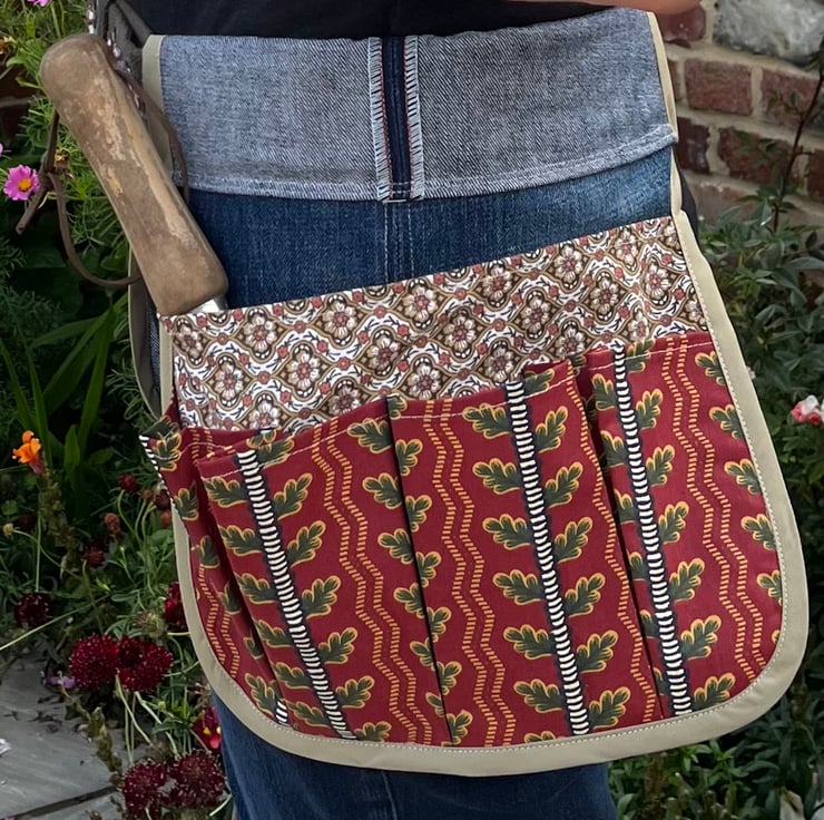 Keep all your garden tools to hand with this tool belt made from recycled denim jeans and vintage Laura Ashley and Sanderson curtain fabric.