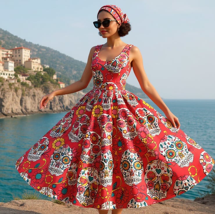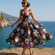 Get ready to rock the 50s look with this vintage style midi dress by Tuxcat This circle skirt dress features a sugar skull print, perfect for any occasion. The scoop neckline and sleeveless design add a touch of elegance, while the zip closure makes it easy to wear. Crafted with in polycotton this dress is both comfortable and stylish.
