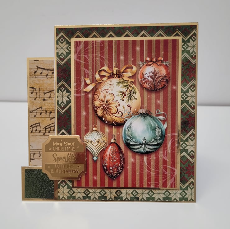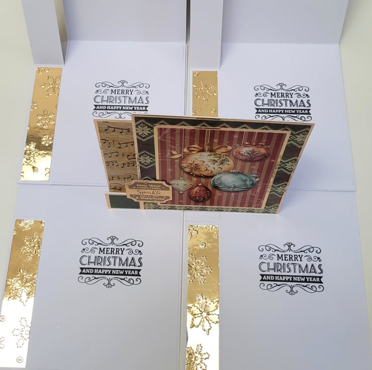 Each card measures 5 x 5 inches (13 x 13 cm), are supplied with plain white envelopes, and each card also contains a stamped sentiment on the inside of the card which reads "Merry Christmas and Happy New Year", as well as a gold snowflake embossed panel.