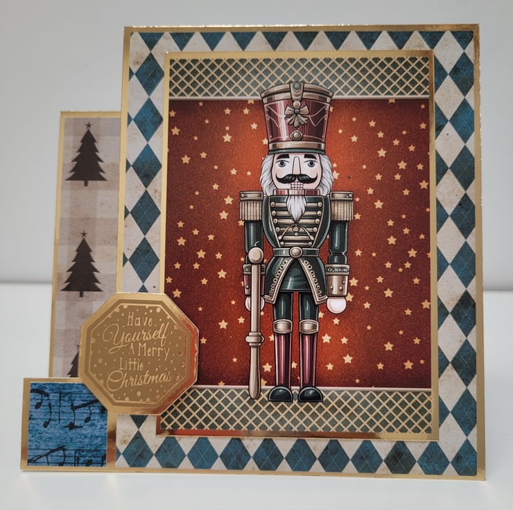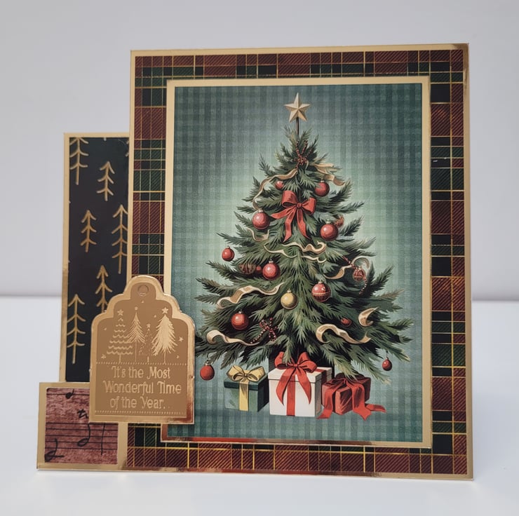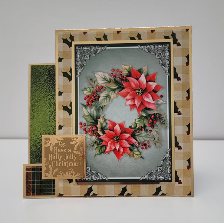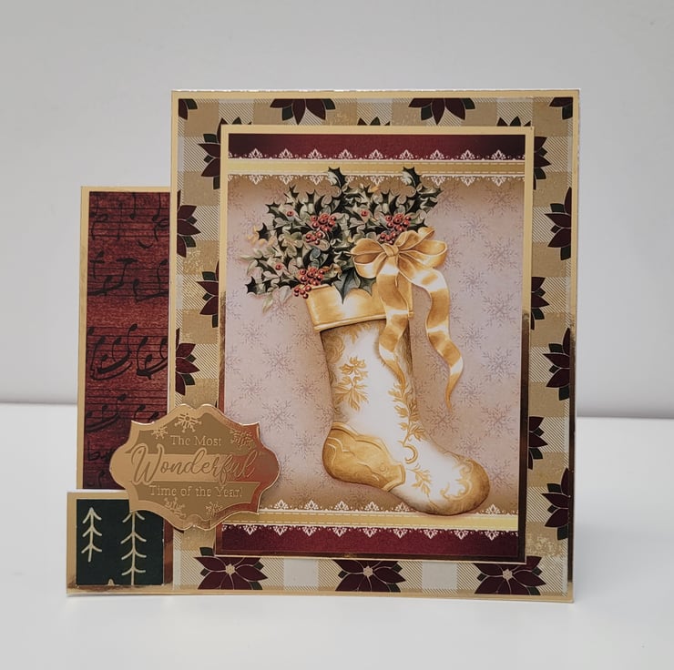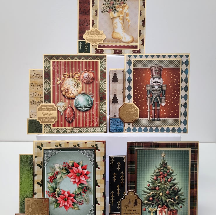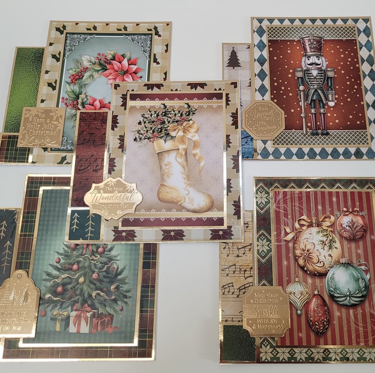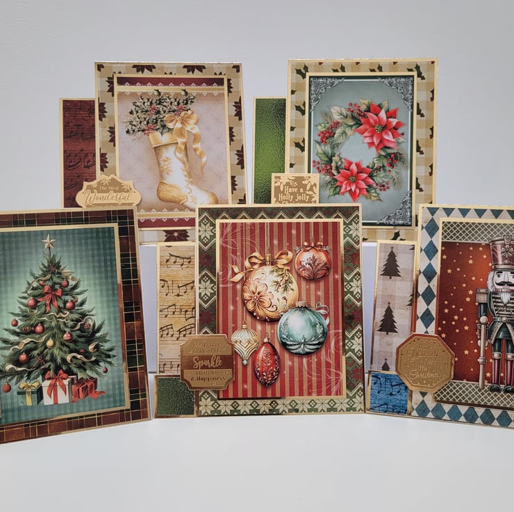 A unique set of 5 handmade Christmas cards featuring traditional festive imagery, accented with gold mirrored card and sentiments which read: