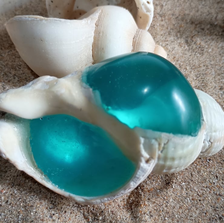 A statement piece born of salt, shimmer, and silence, Siren Glass is a bold sculpture that captures the essence of the ocean's mystery. Measuring 7.5cm by 4cm, it features a striking infusion of deep aqua resin, cradled within the natural curves of a sea-worn shell.