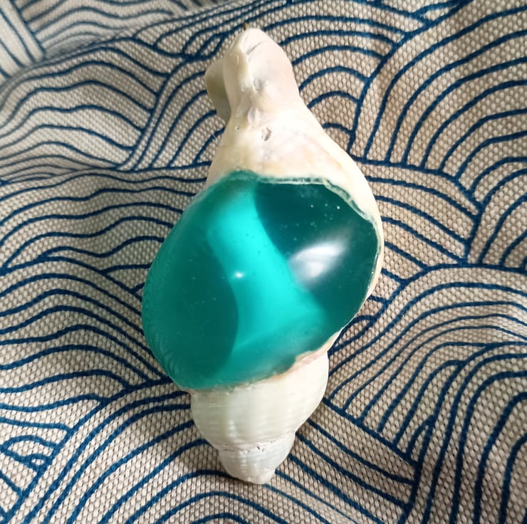 I gather these naturally broken shells from the Yorkshire coast, each one shaped by weather, waves, and time. Some look like fossils, some like tiny boats, and some like the sort of thing you’d find in a tide sprite’s coat pocket. I fill their hollows with resin in ocean colours — clear, blue, green — like water paused mid-flow.