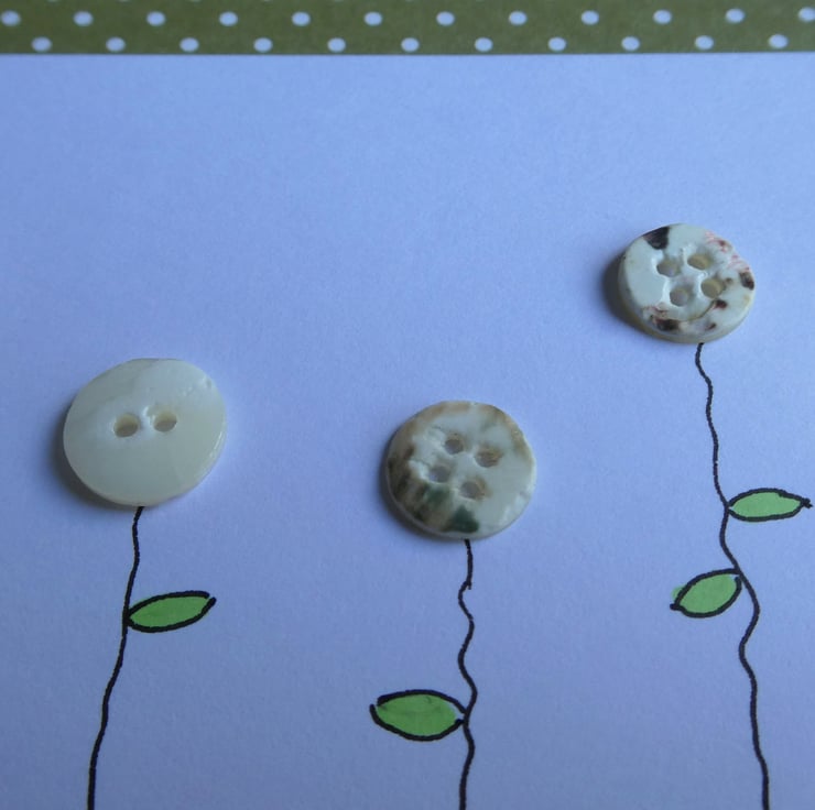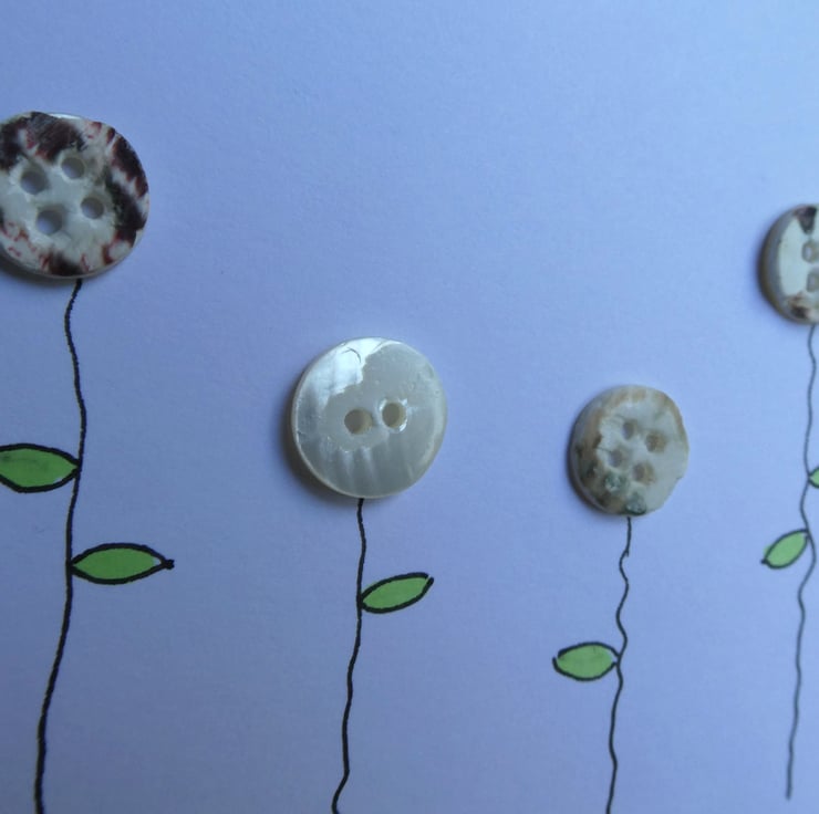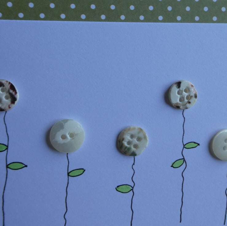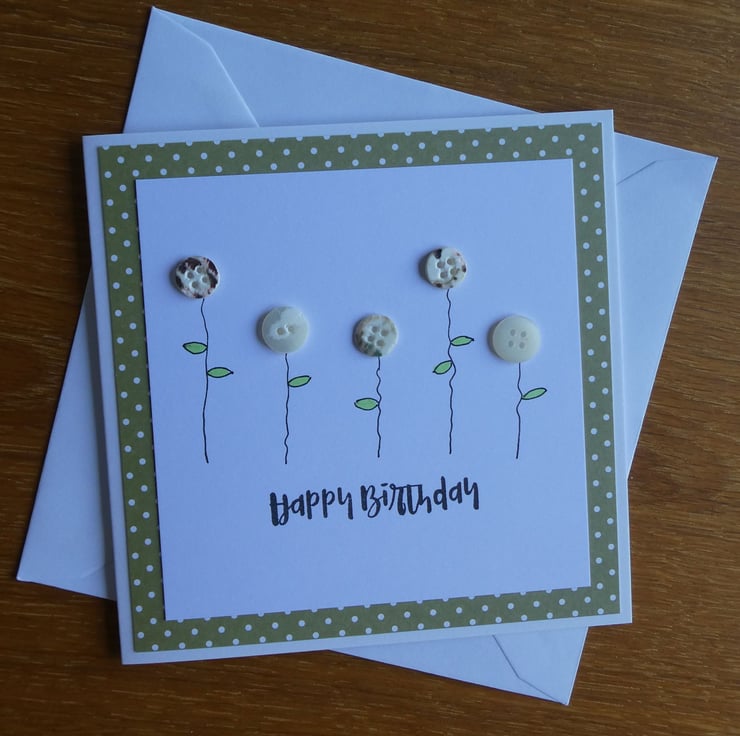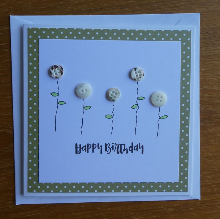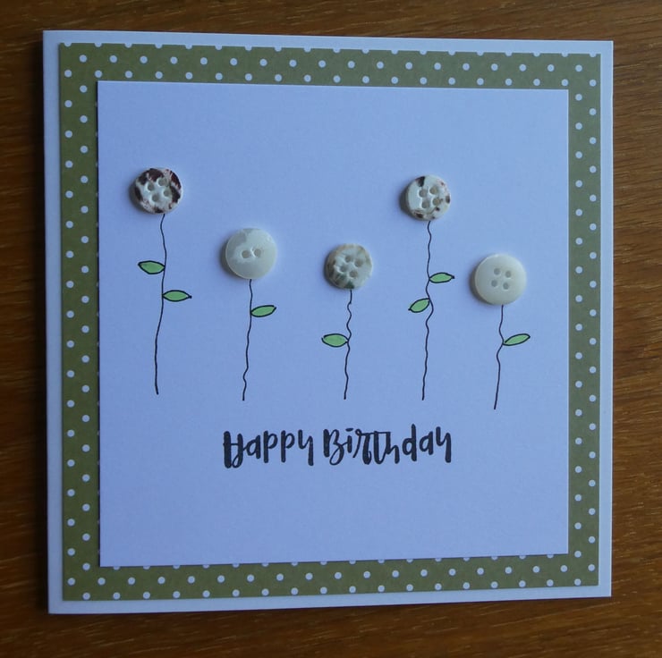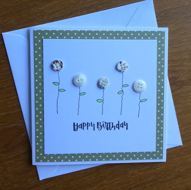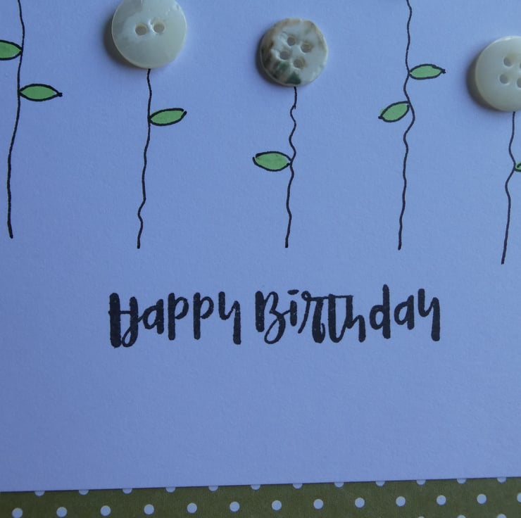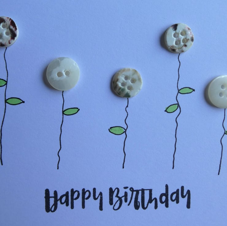 This pretty birthday card has a row of flowers made from vintage buttons and the message Happy Birthday.