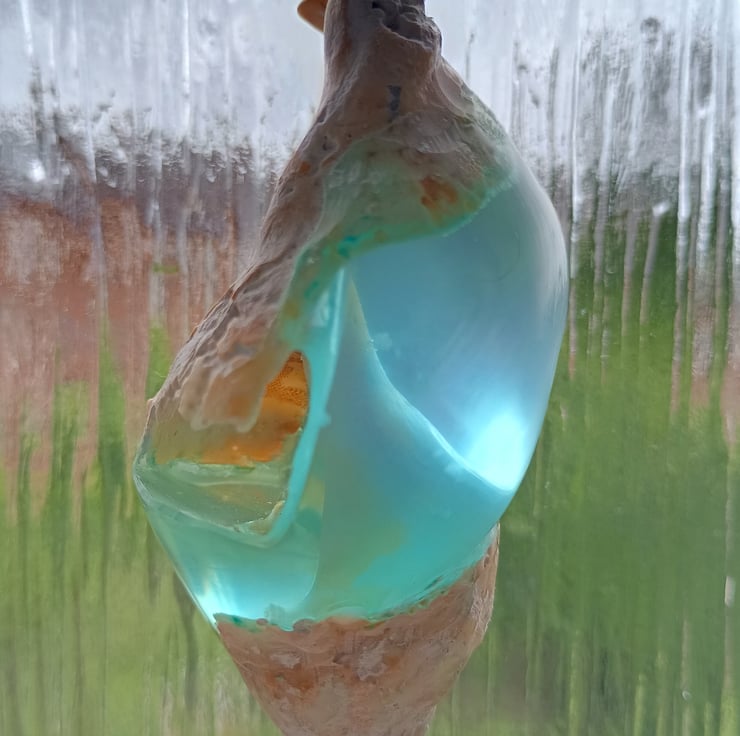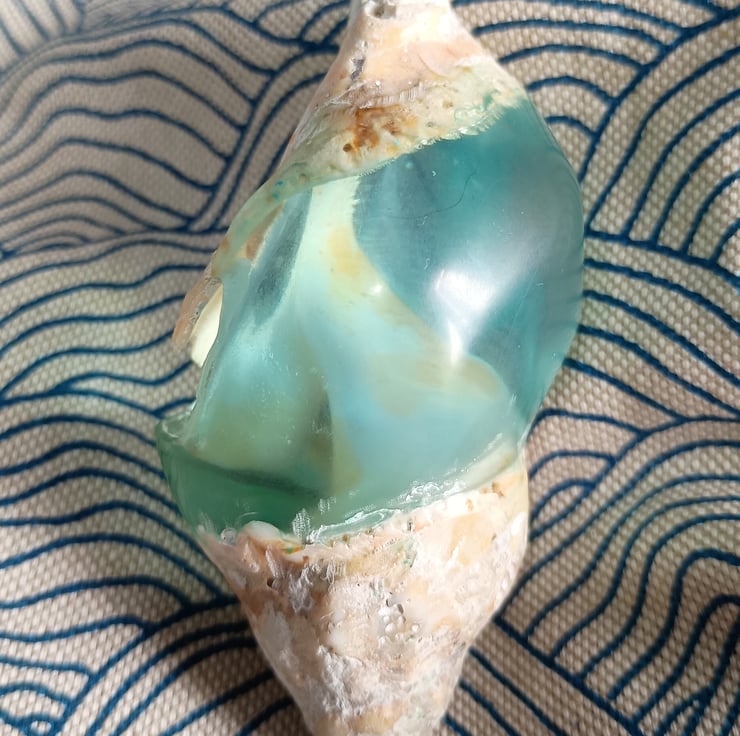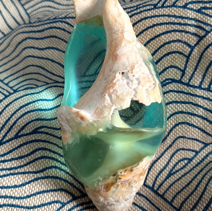 I gather these naturally broken shells from the Yorkshire coast, each one shaped by weather, waves, and time. Some look like fossils, some like tiny boats, and some like the sort of thing you’d find in a tide sprite’s coat pocket. I fill their hollows with resin in ocean colours — clear, blue, green — like water paused mid-flow.