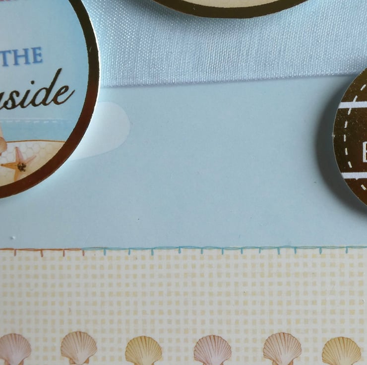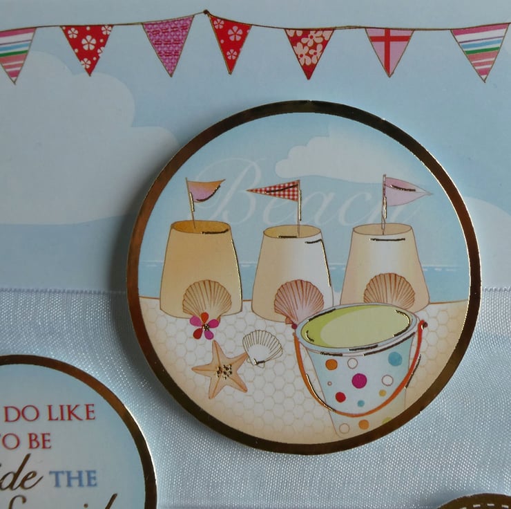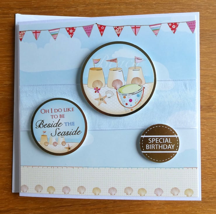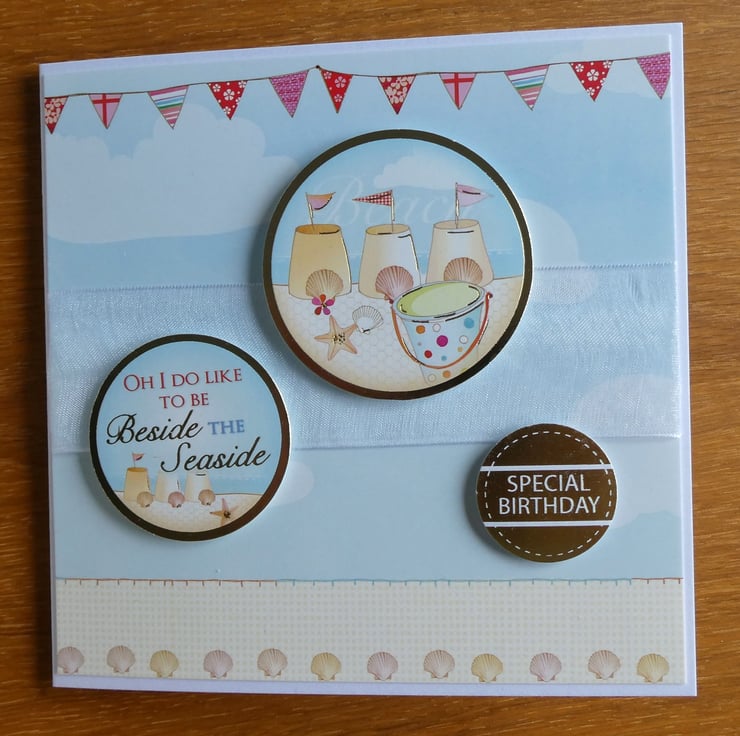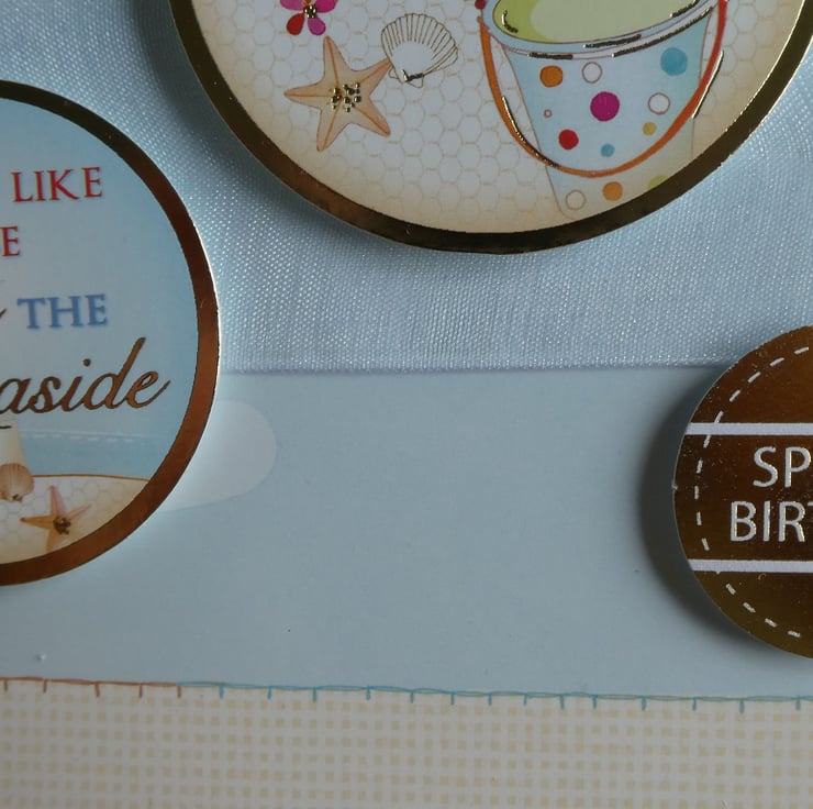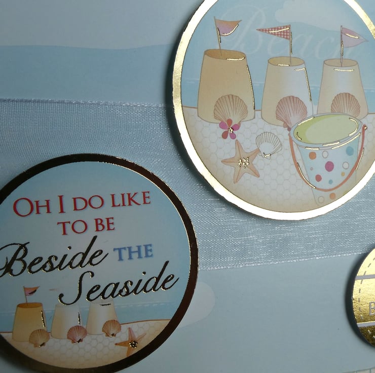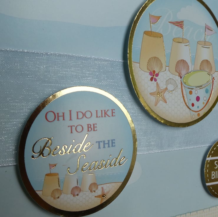 A band of white organza ribbon has been wrapped around the centre of the card and three circular toppers in assorted sizes have been added. One with an image of 3 sand castles with a bucket and shells, one with a smaller similar image and the words Oh I Do Like To Be Beside The Seaside and the final one with the message Special Birthday in white on a shiny gold background. All of the toppers have been raised on foam pads to add dimension.