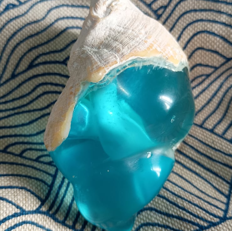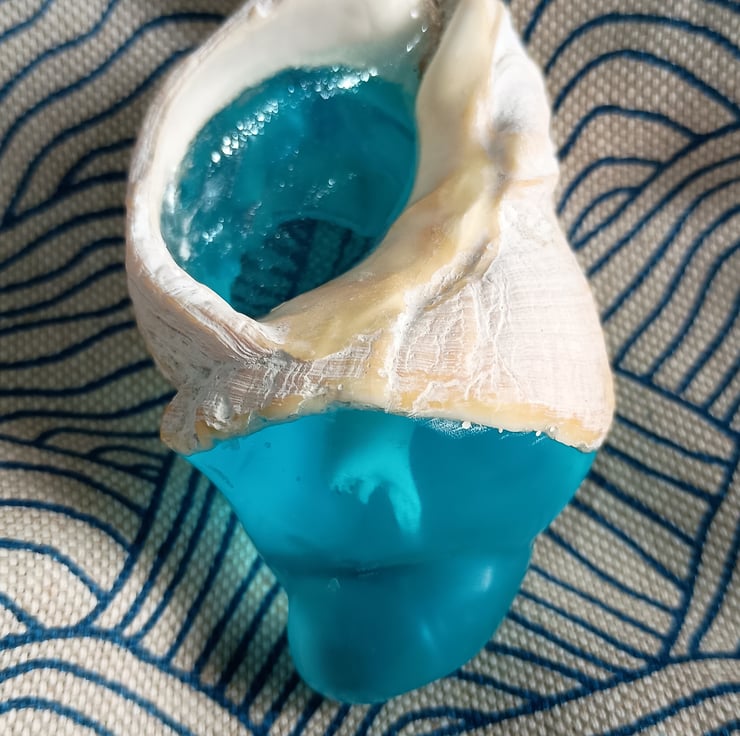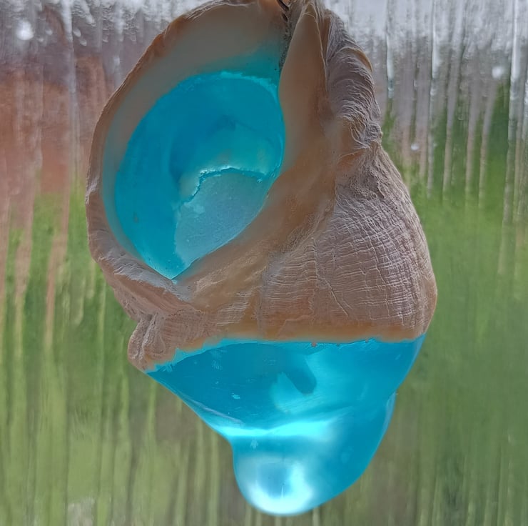 I gather these naturally broken shells from the Yorkshire coast, each one shaped by weather, waves, and time. Some look like fossils, some like tiny boats, and some like the sort of thing you’d find in a tide sprite’s coat pocket. I fill their hollows with resin in ocean colours — clear, blue, green — like water paused mid-flow.