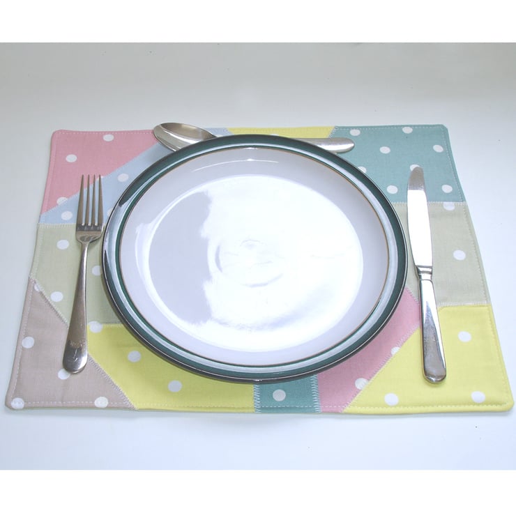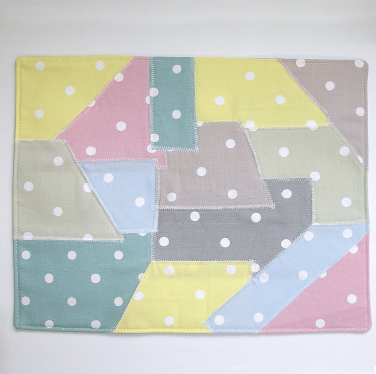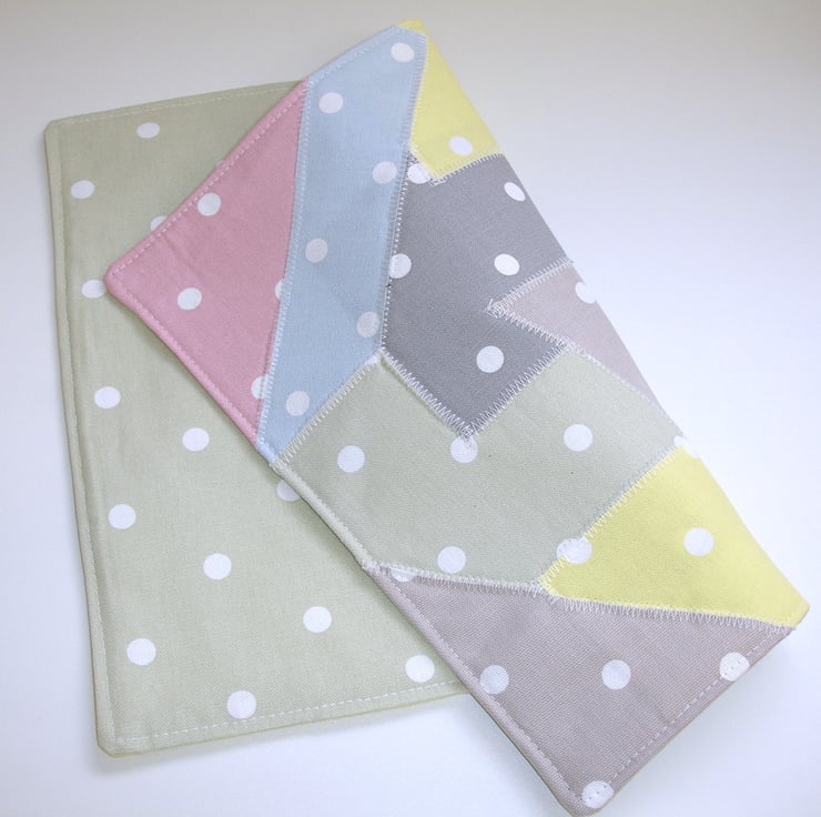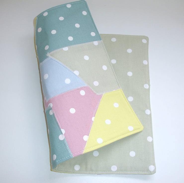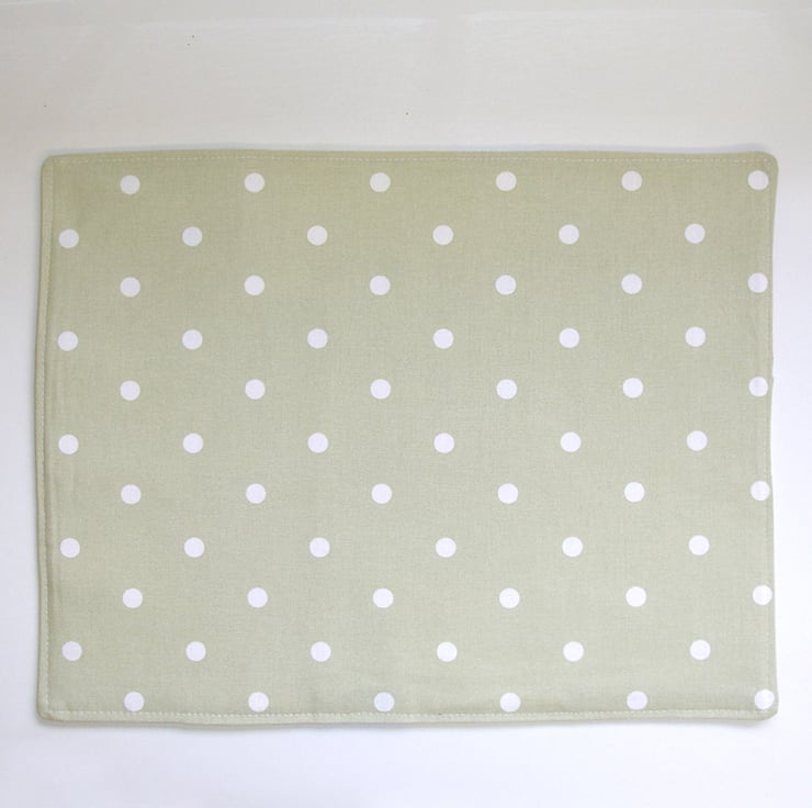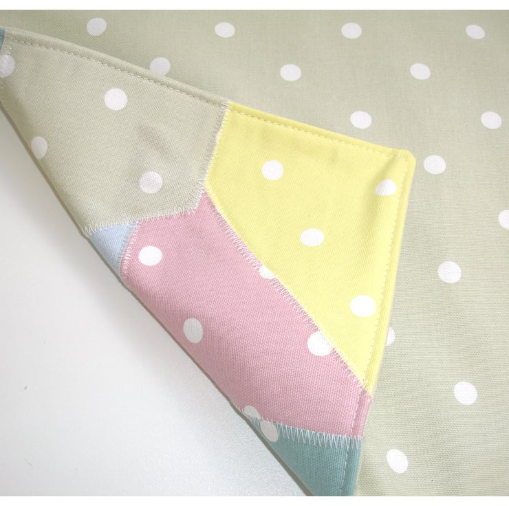 A random patchwork of polka dot colours on one side and plain polka dots on a sage green background on the other side.