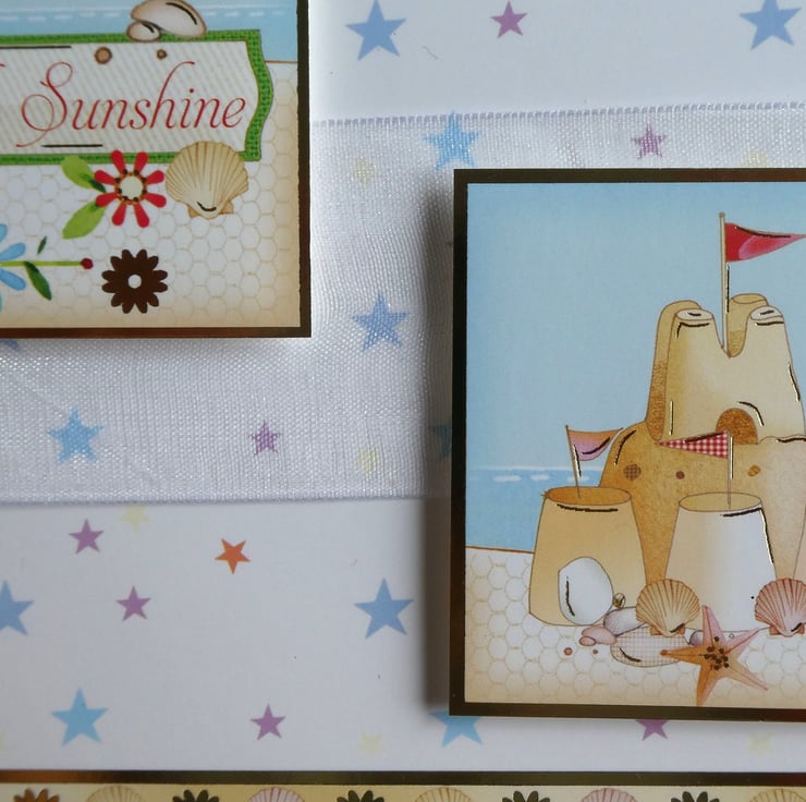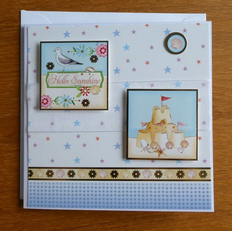 This summery beach themed card has images of sand castles, shells and a gull and the message Hello Sunshine. It could be sent as a birthday card, just to say hello or for many different occasions.