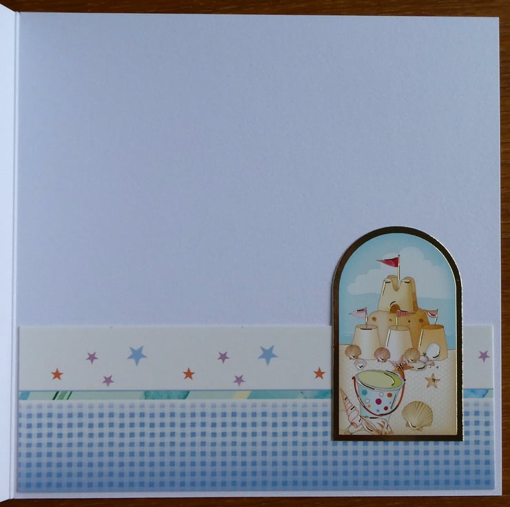 Along the bottom edge of the Inside of the card is a strip of matching patterned card with an image of sand castles and a dotty bucket.