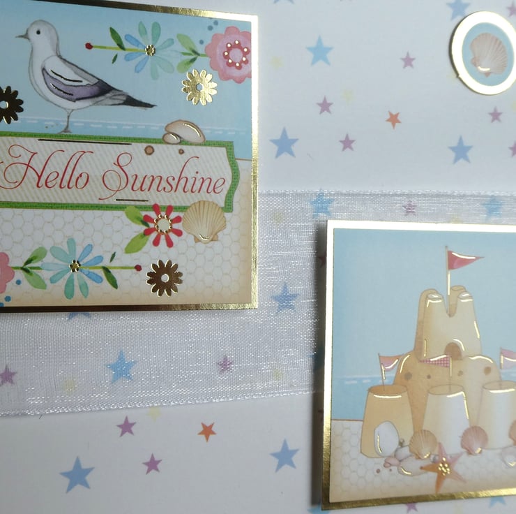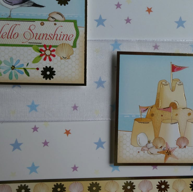 A band of white organza ribbon has been wrapped around the centre of the card and 2 square toppers have been added, raised on foam pads to add dimension. One with an image of sand castles with shells and flags and one with an image of a gull and flowers and the words Hello Sunshine.