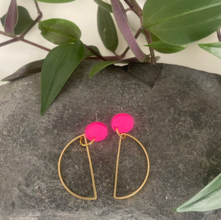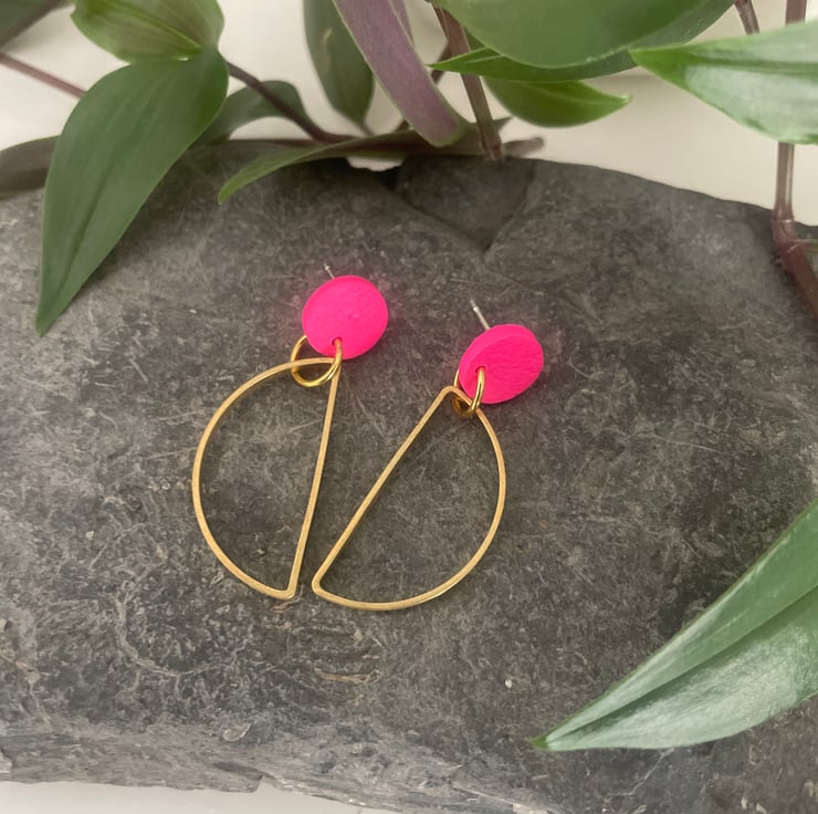A striking pair of half circle design polymer clay earrings in bright pink and brass. Perfect design for minimalist lovers with an extra touch of charm. Lightweight and hypoallergenic.