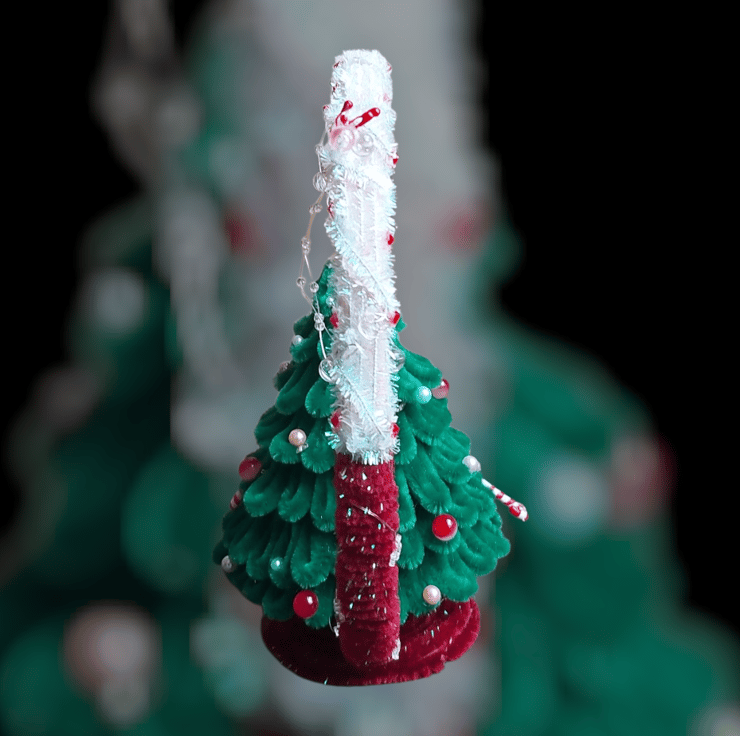 A fluffy green Christmas tree made from soft pipe cleaners, adorned with pearl baubles and candy canes