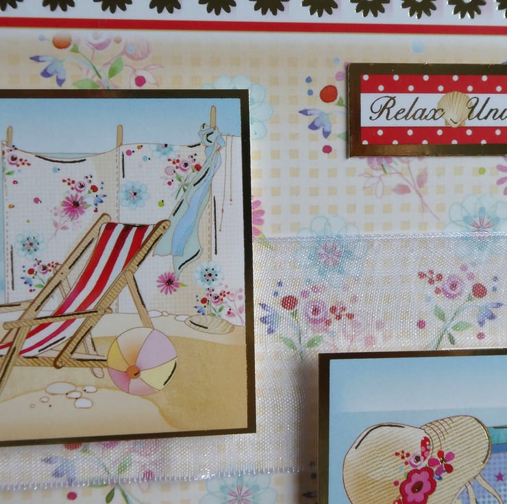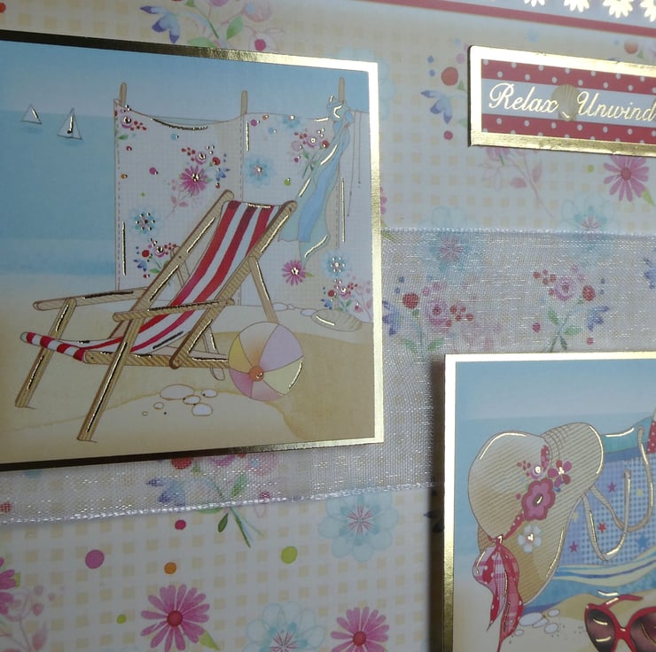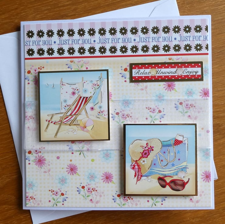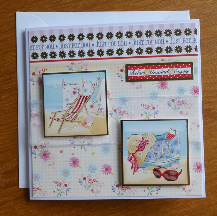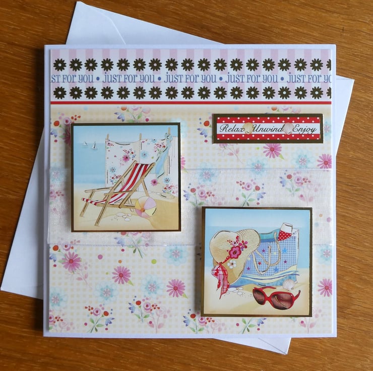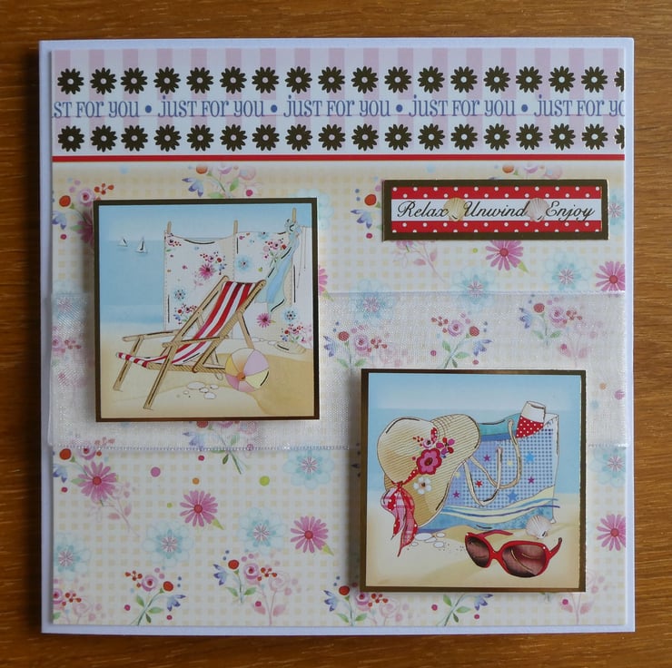 This summery beach themed card has images of a deckchair, windbreak and a beach bag full of supplies and the messages Just For You, Smile It's Your Special Day and Relax, Unwind, Enjoy. It could be sent as a birthday or retirement card.