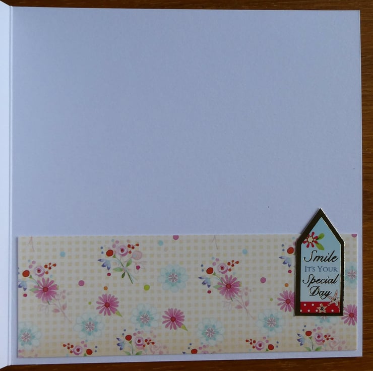 Along the bottom edge of the inside of the card is a strip of matching patterned card with a message which reads Smile It's Your Special Day.