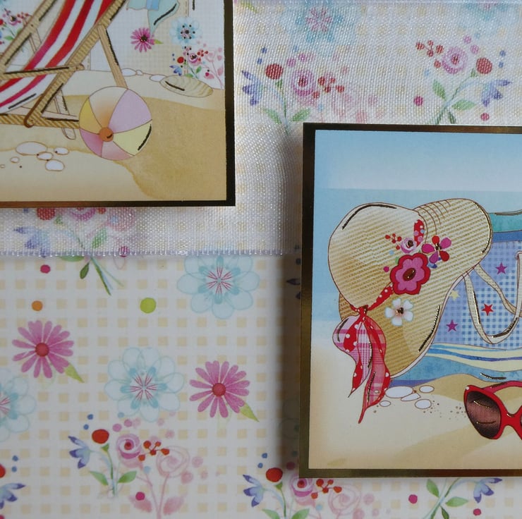 A band of white organza ribbon has been wrapped around the centre of the card and 2 square toppers have been added, raised on foam pads to add dimension. One with an image of a deckchair in front of a windbreak and one with a beach bag overflowing with supplies for a day on the beach.