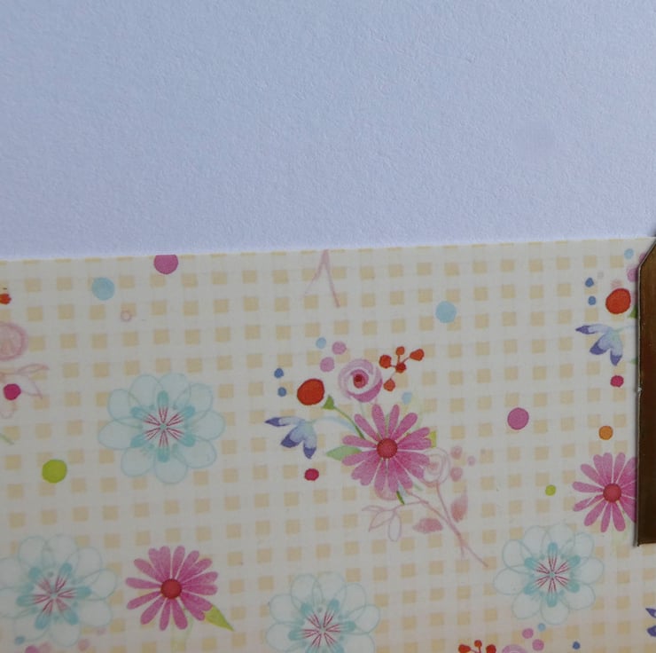 A printed background of multi coloured pastel flowers on a cream background has a band of gold flowers, pink and white stripes and the words Just For You along the top edge.