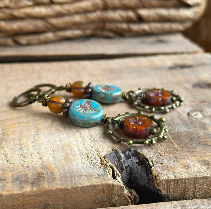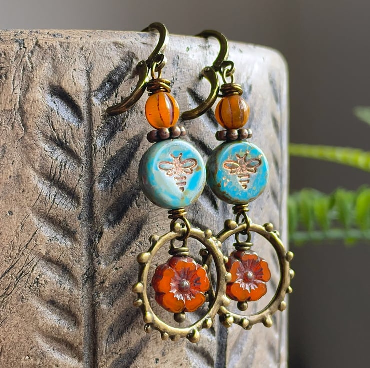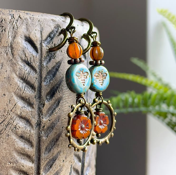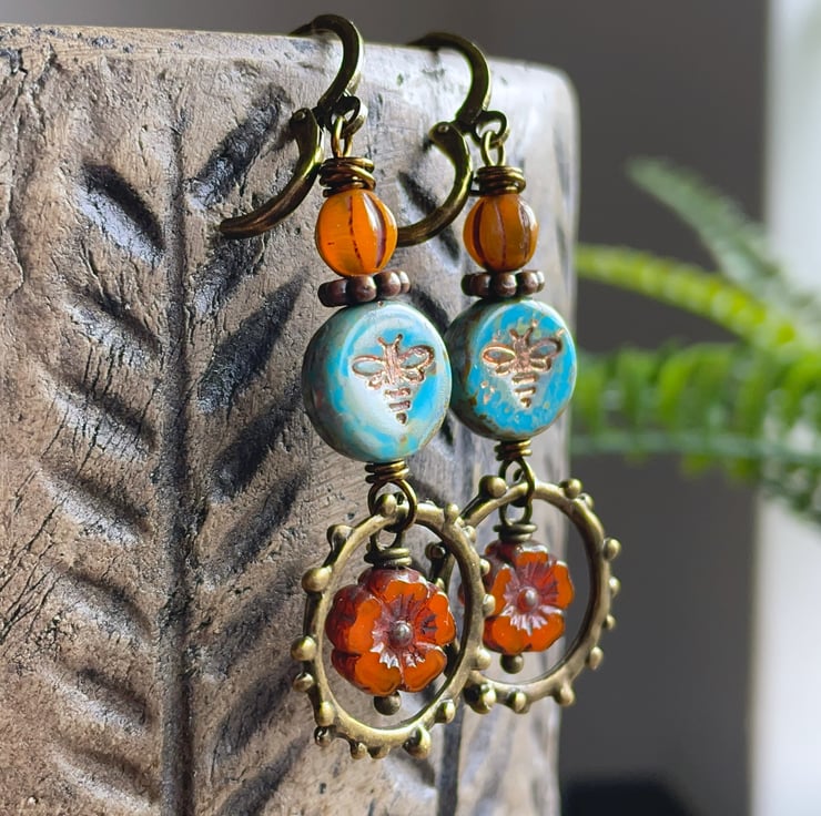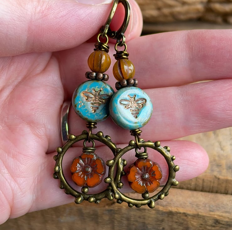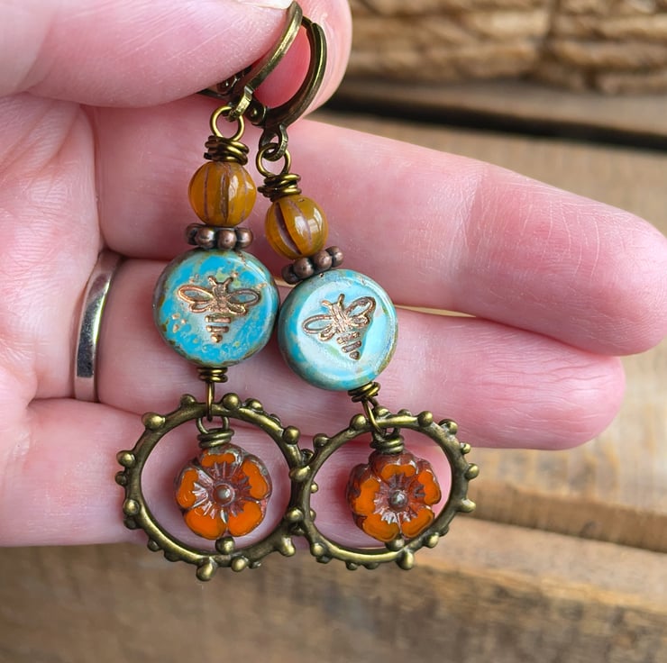 Above the rings sit turquoise-blue Czech glass coins, each stamped with a rustic bumblebee motif, alongside warm orange melon beads. A dark copper-tone daisy spacer adds a lovely finishing touch.