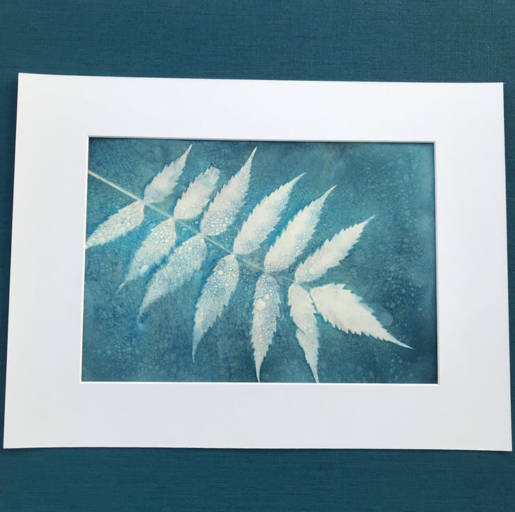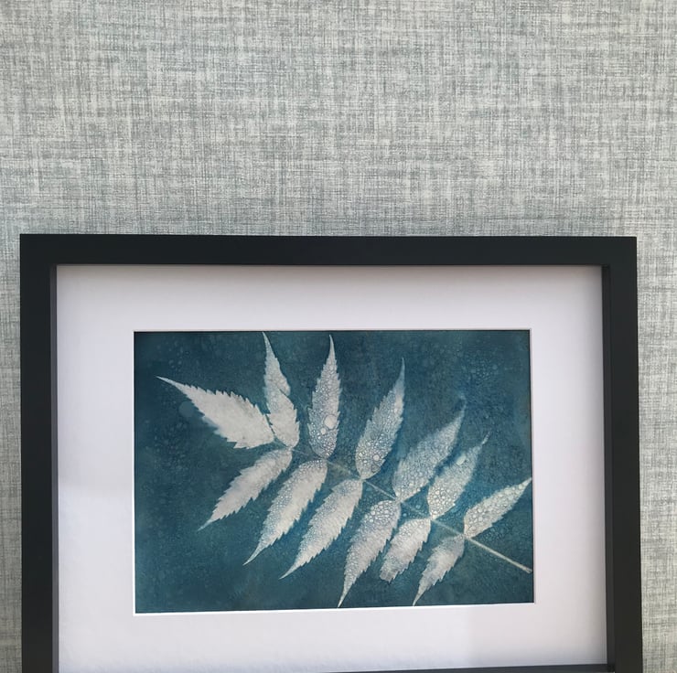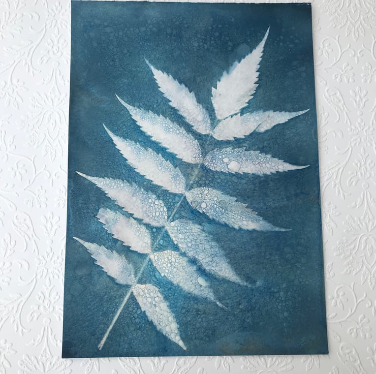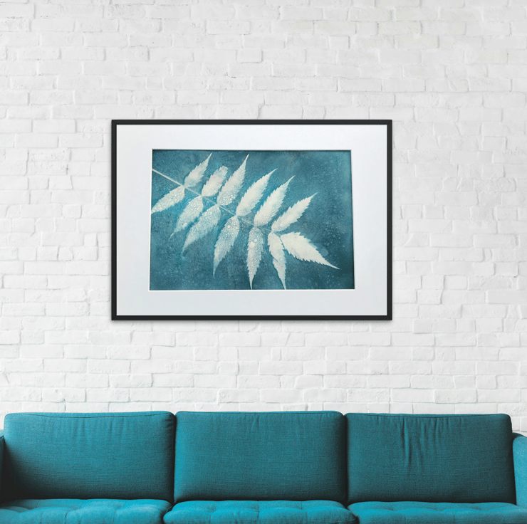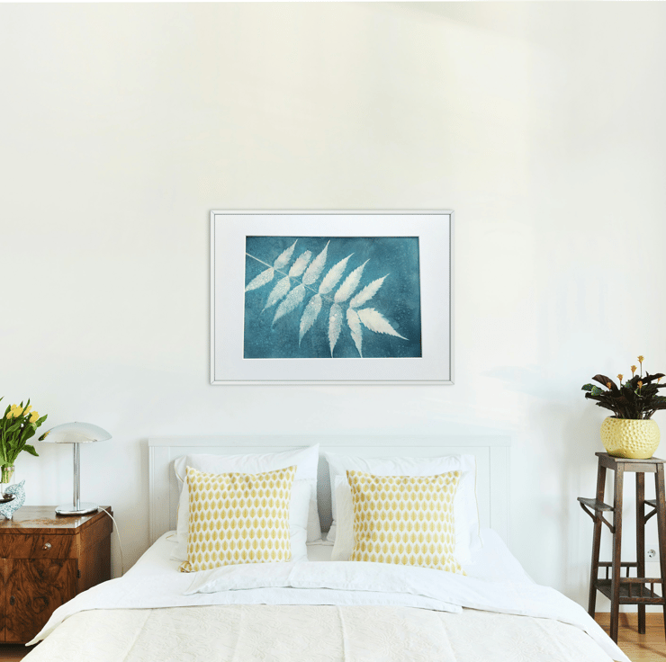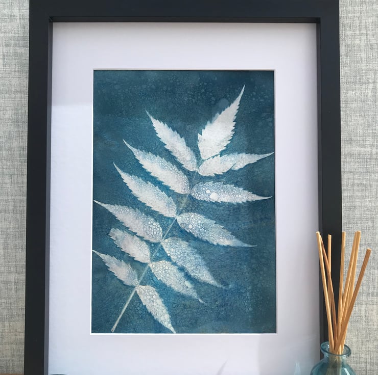 Wall art- Floating on a sea of bubbles, the long slender leaf from the Staghorn Sumac shrub, in this pretty botanical photogram. Made using the Wet Cyanotype technique by adding dilute vinegar and bubbles to the paper before exposure, giving it an ethereal look and turquoise colours. The photogram can be displayed in landscape or portrait.