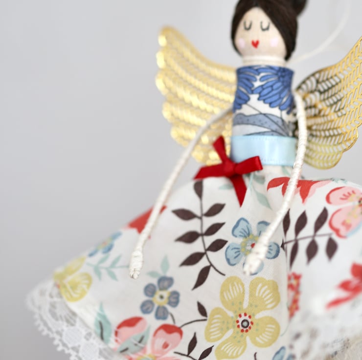Hand painted shoes and face on the peg, lace trimming on the skirt, liberty fabric bodice with ribbon and bow attachment.