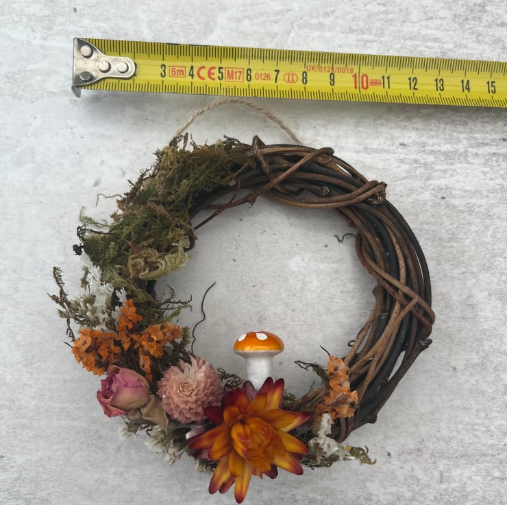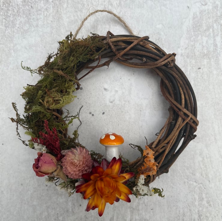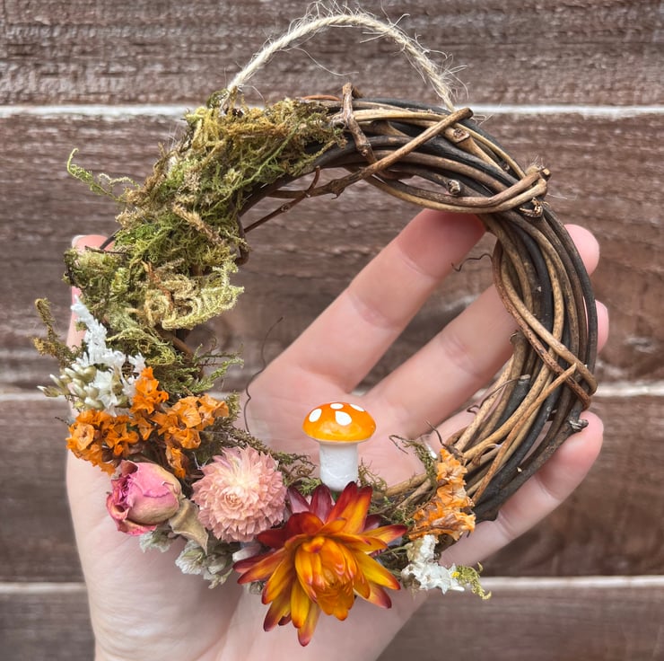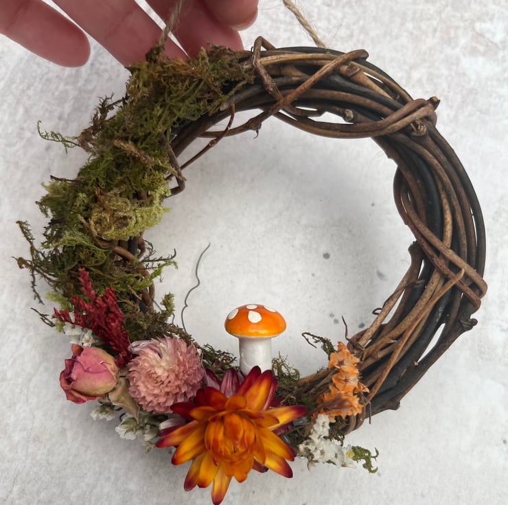 A charming mini dried flower wreath, decorated with a whimsical toadstool and natural blooms. Perfect for adding a touch of woodland magic to your home décor or gifting to a nature lover.