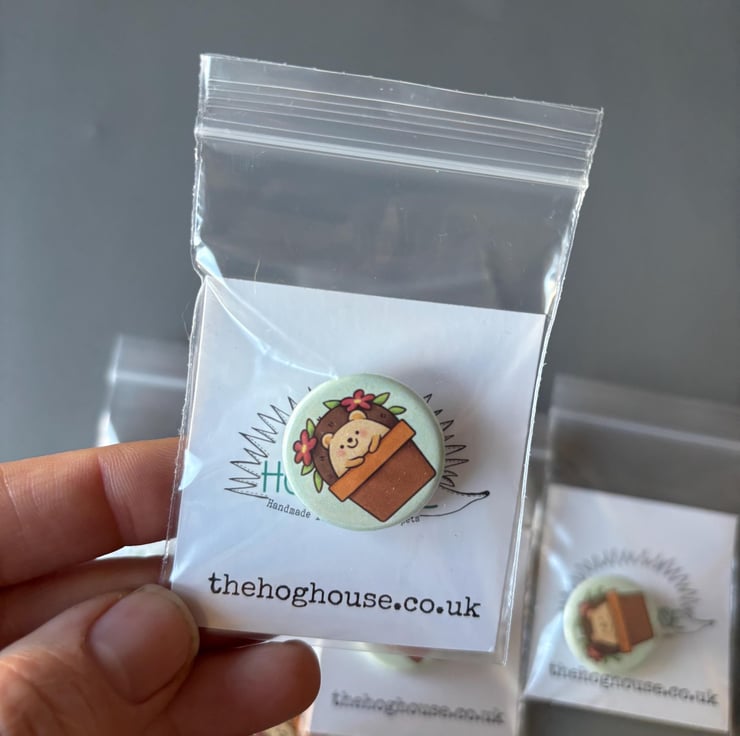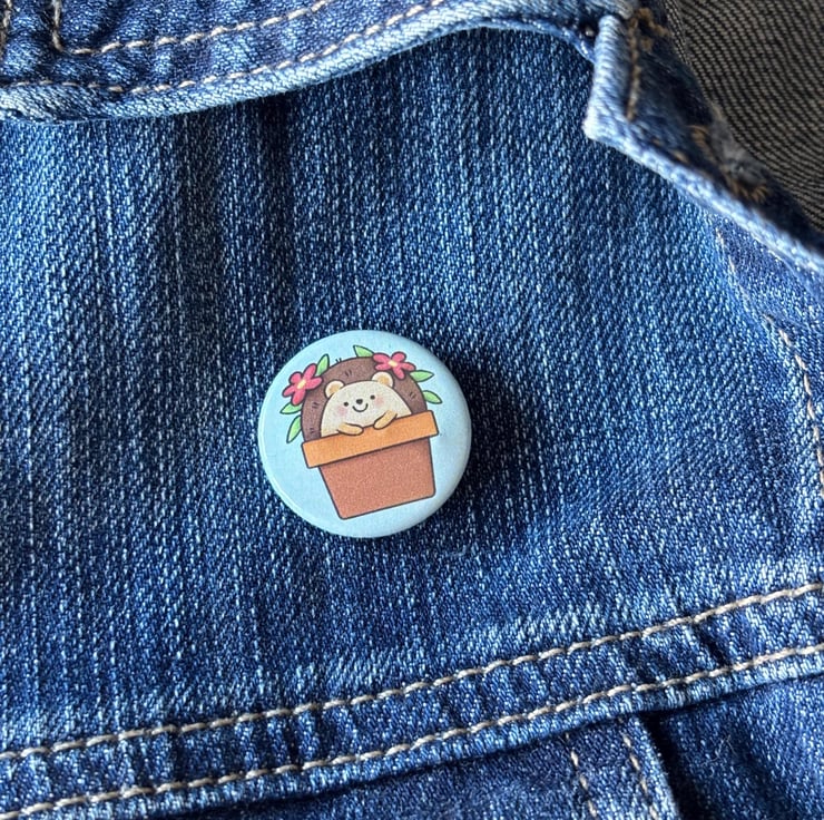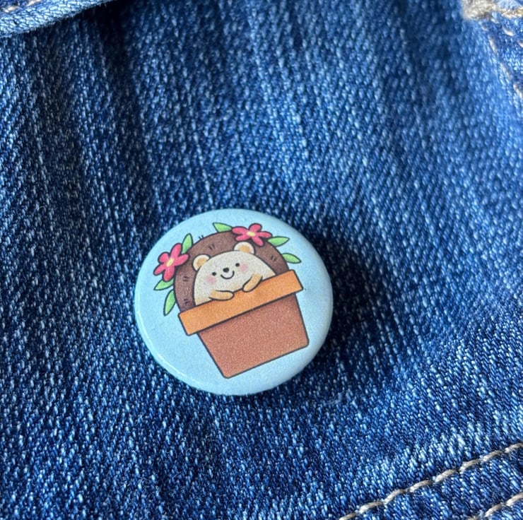 Hedgehog in plant pot badge. 25mm badge. Hedgehog pin. Animal lover gift.