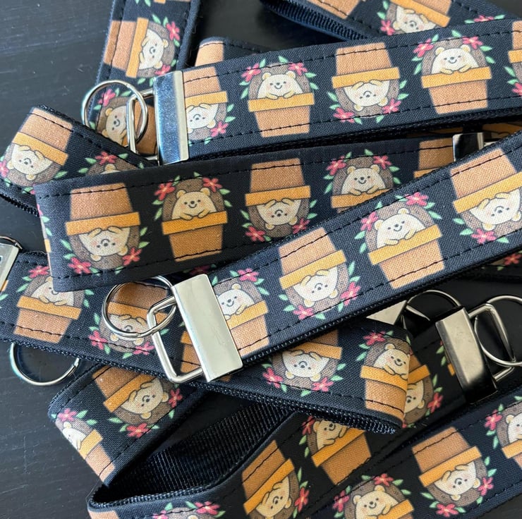 Hedgehog in plant pot wristlet keychain. Hedgehog keyring. Hedgehog wrist strap