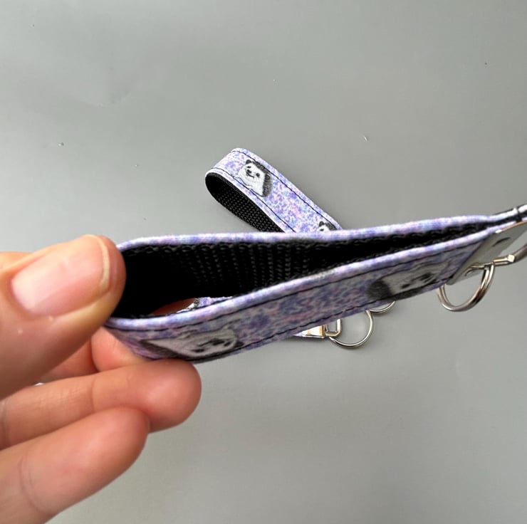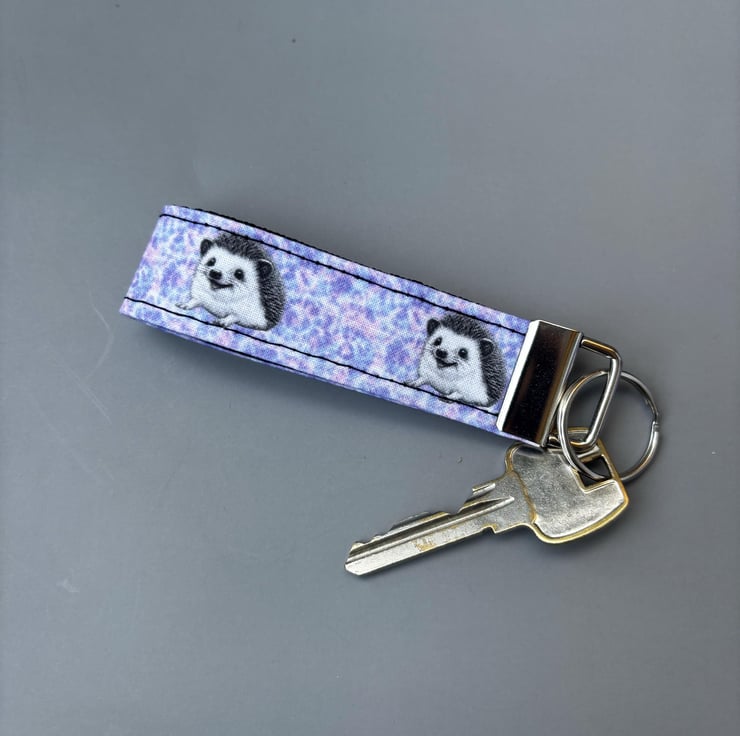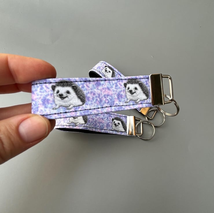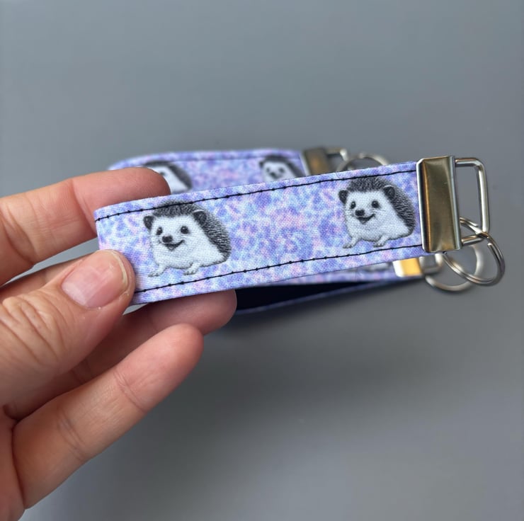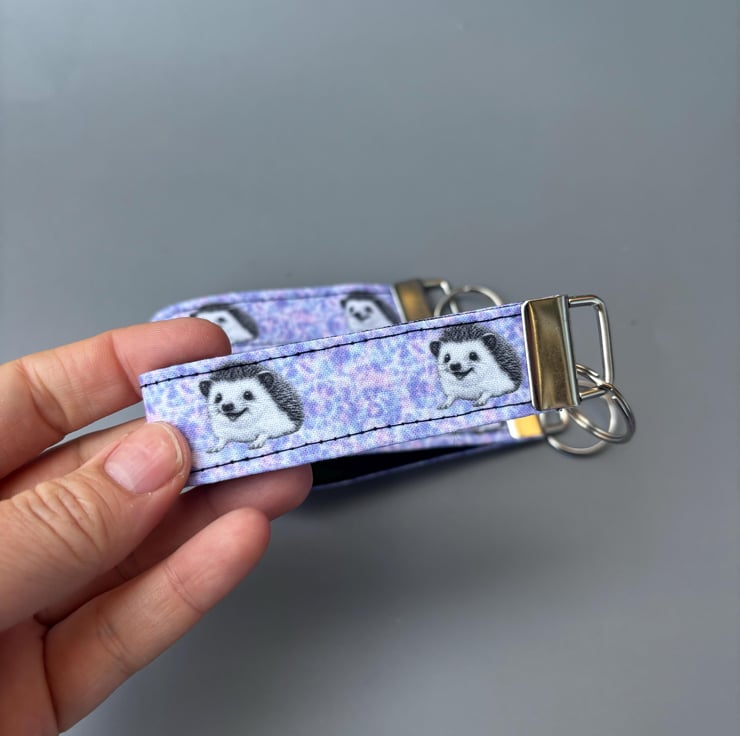 You're going to squeak with excitement when this arrives. The Happy Quills pattern is on the front with black strap on the inside. The key ring is made from quality cotton fabric, strengthened with interfacing and sewn to thick strapping making it very durable for every day use.
