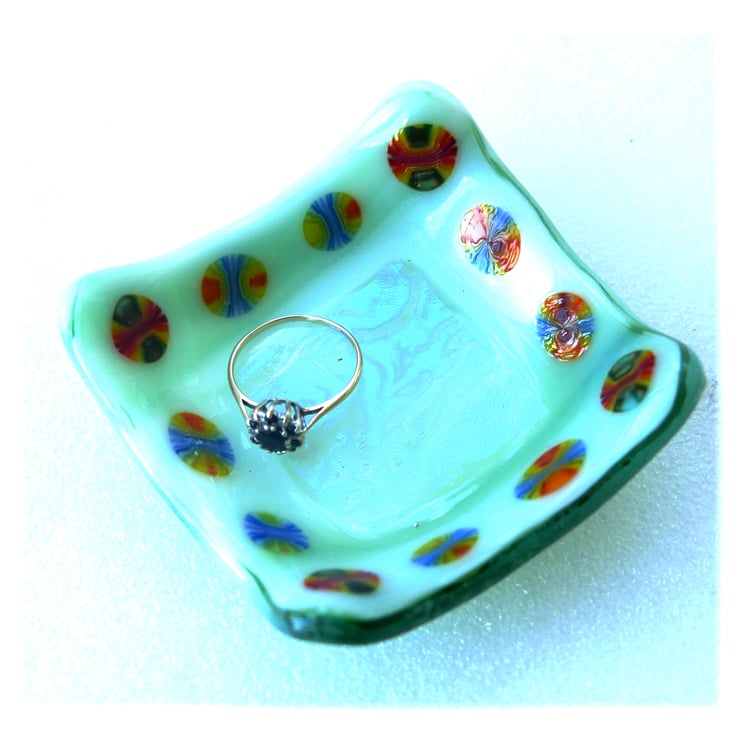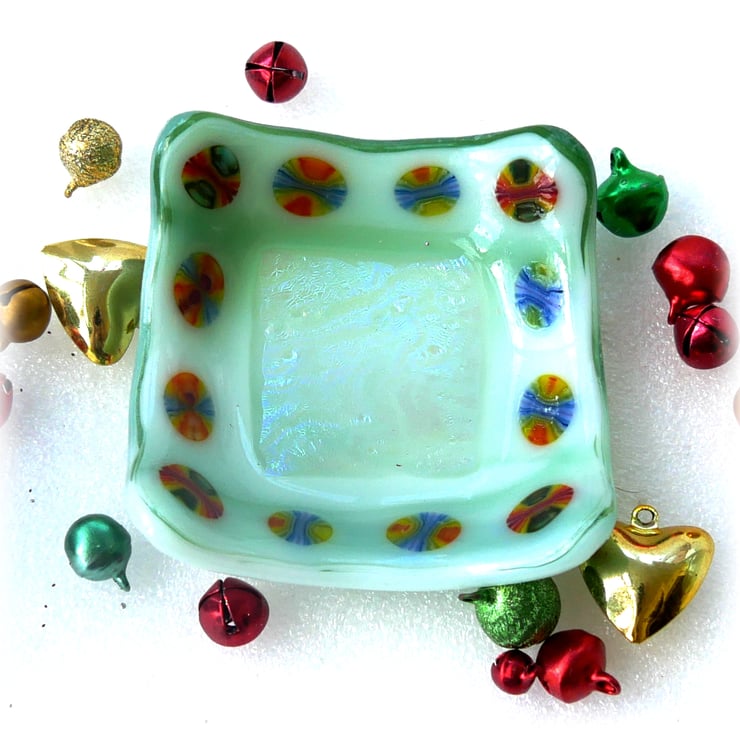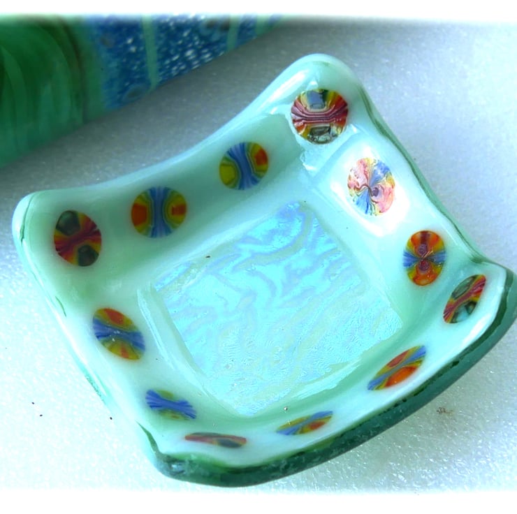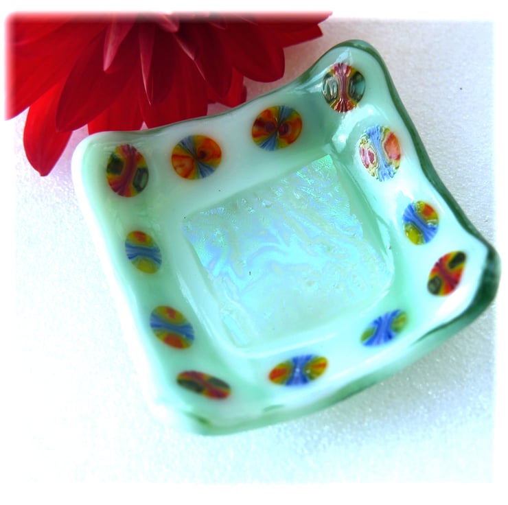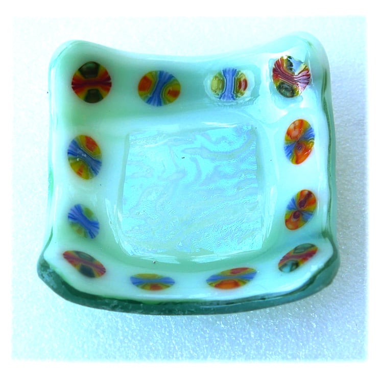The base is an opaque streaky pale green glass. In the centre is a big square of wonderful dichroic shimmery textured glass. Then a border of millefiori slices, rainbow colours..