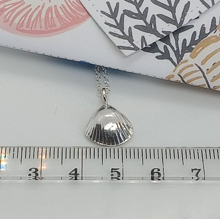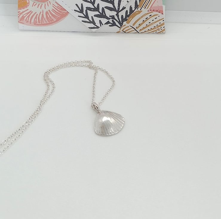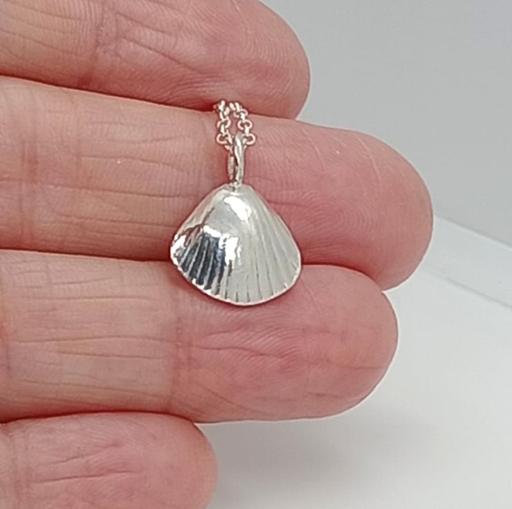 Handmade fine silver cockle shell pendant on a 18 inch sterling silver chain.