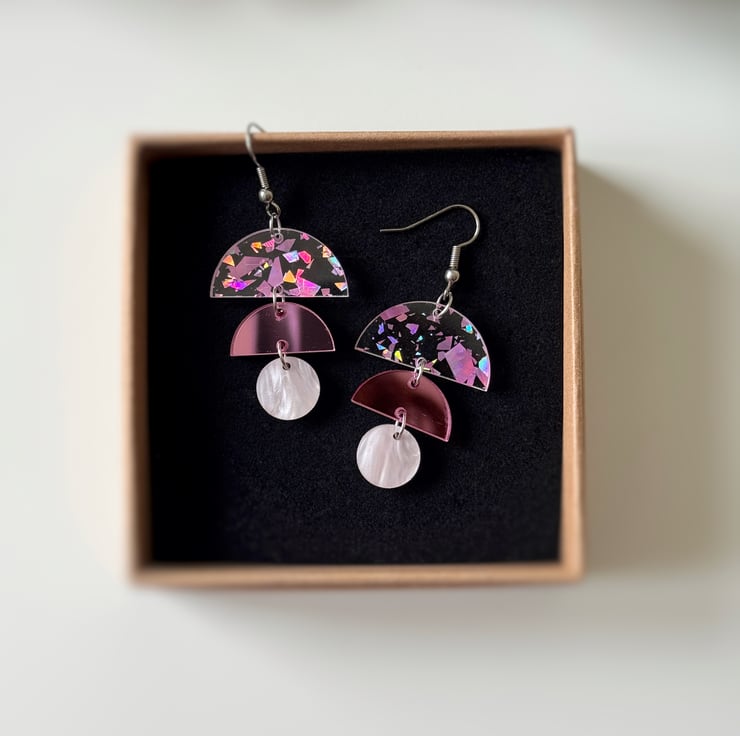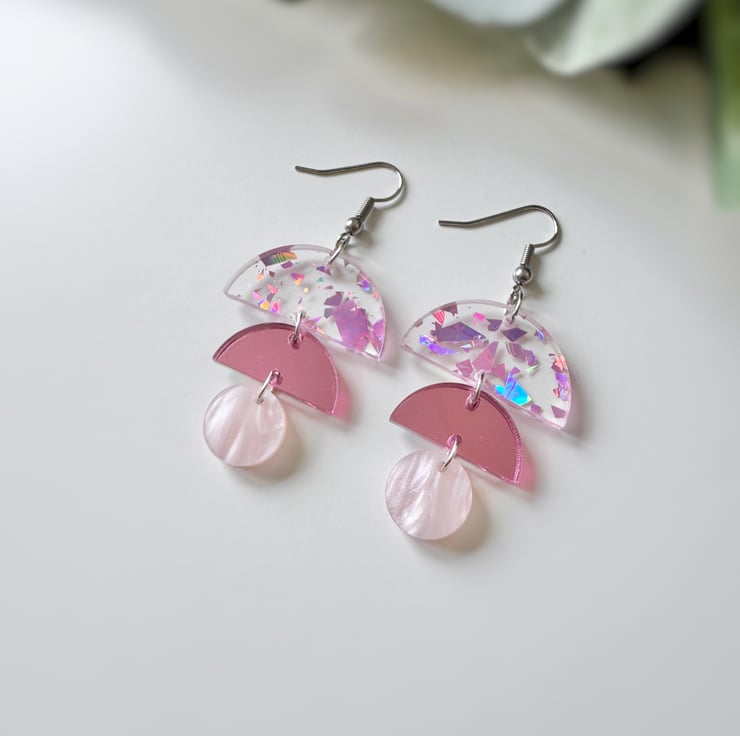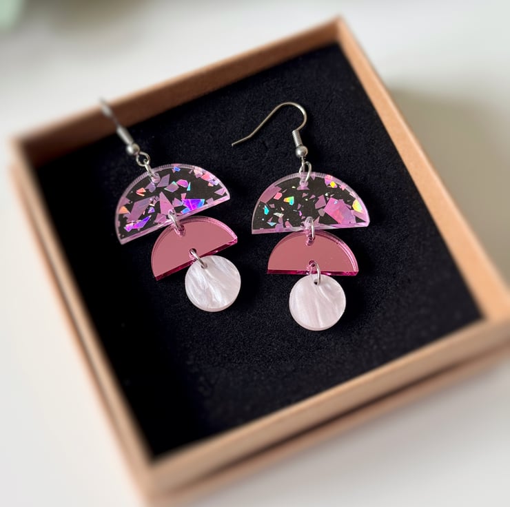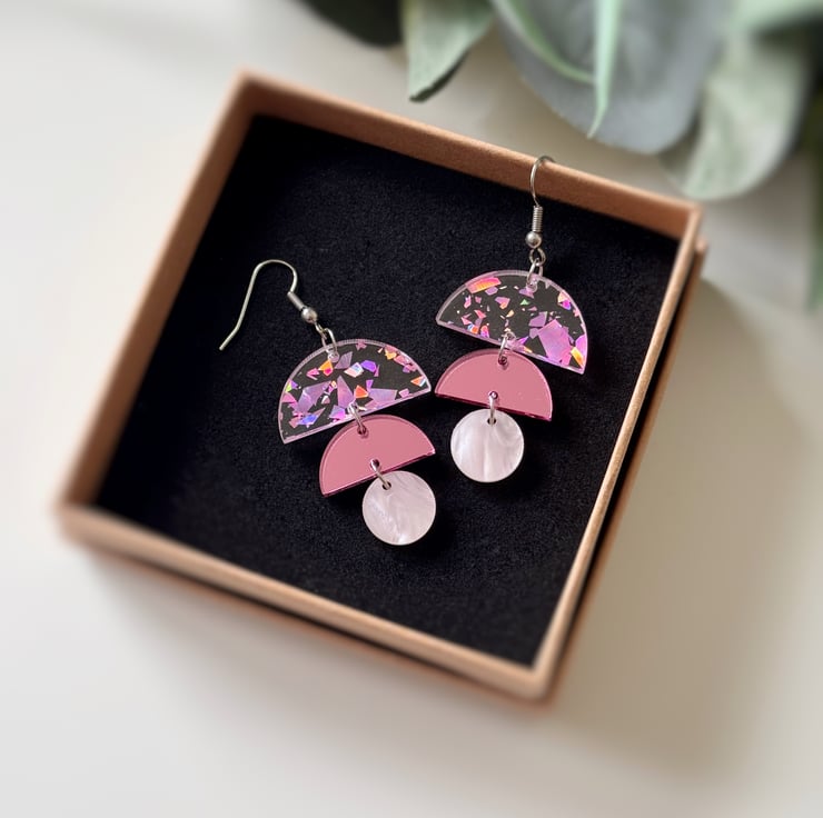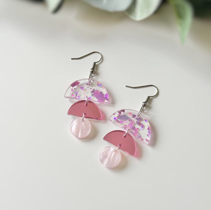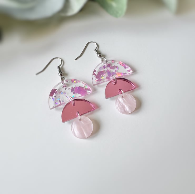 Made from lightweight laser-cut acrylic, this design features a playful three tier of iridescent confetti arcs, blush-toned mirrored pink mid pieces, and pearly soft-pink circles that catch the light beautifully.