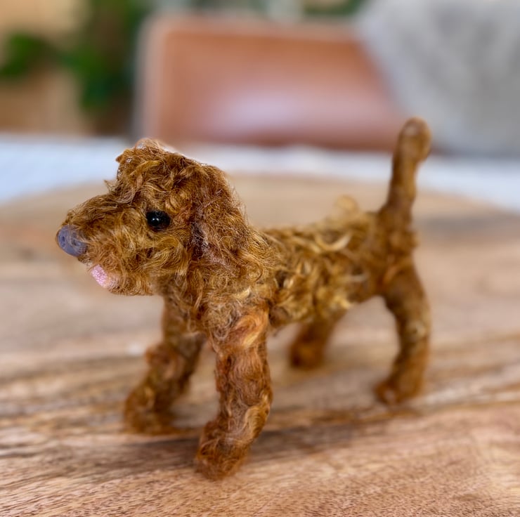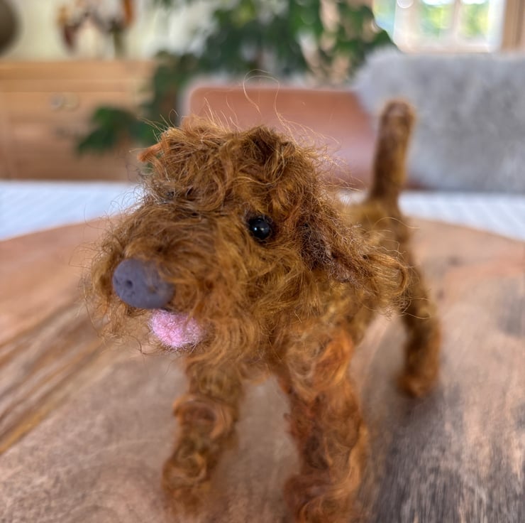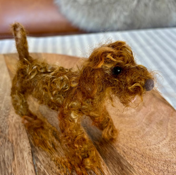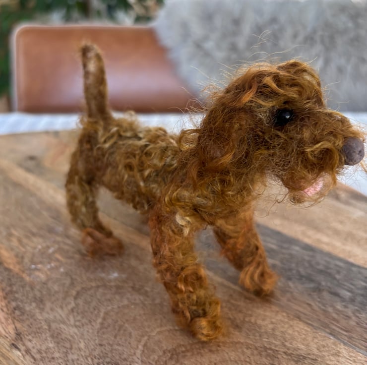 A cute small needle felt curly coat brown Cockapoo style dog, handmade with 100% Corriedale wool. Available to make in different colours