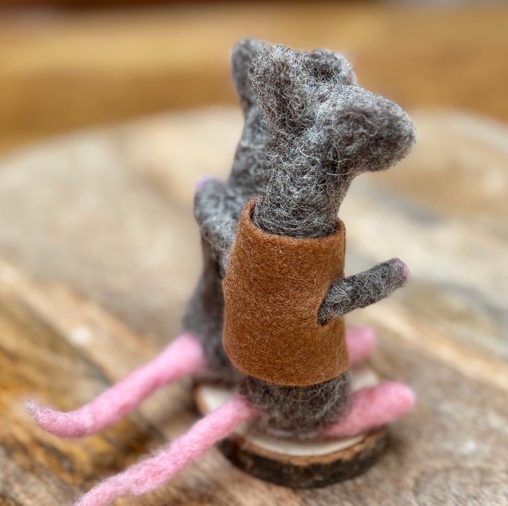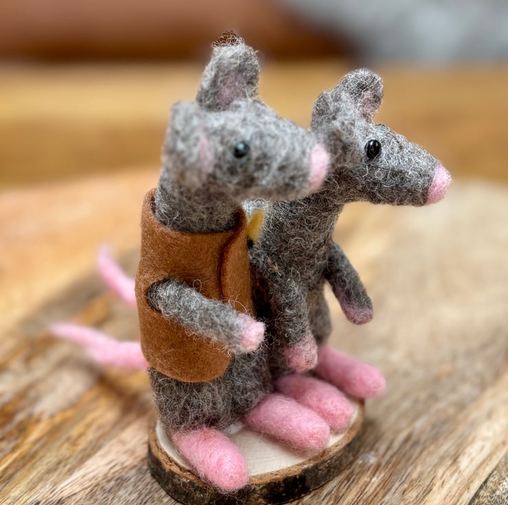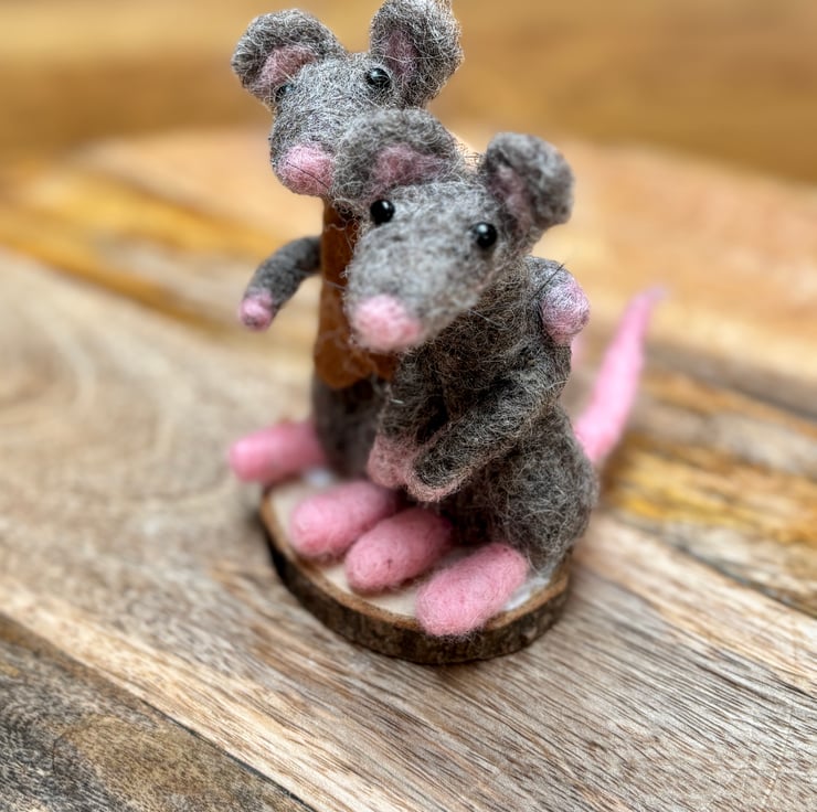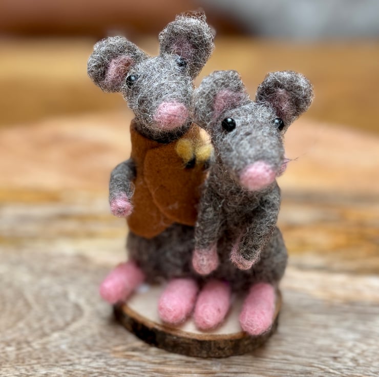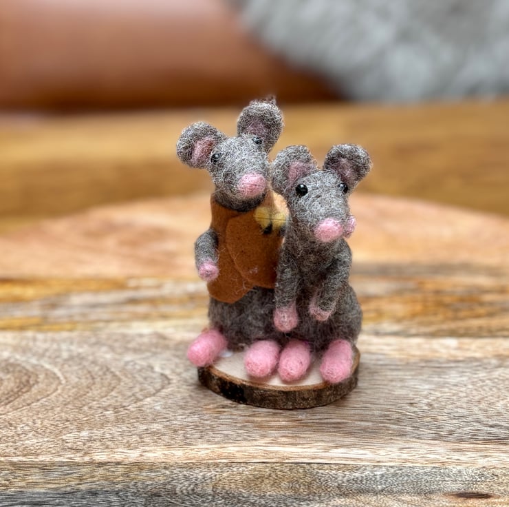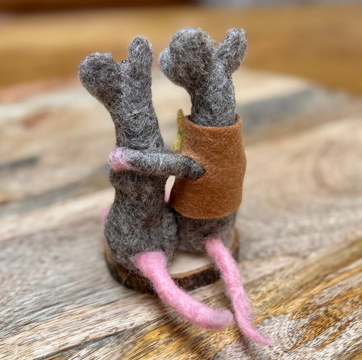 A pair of mice lovers on a wooden slice standing around 13cm tall. 100% wool, hand felted. No pattern so each one unique. Fab for any woodland wildlife lover in your life as a gift, collectible.